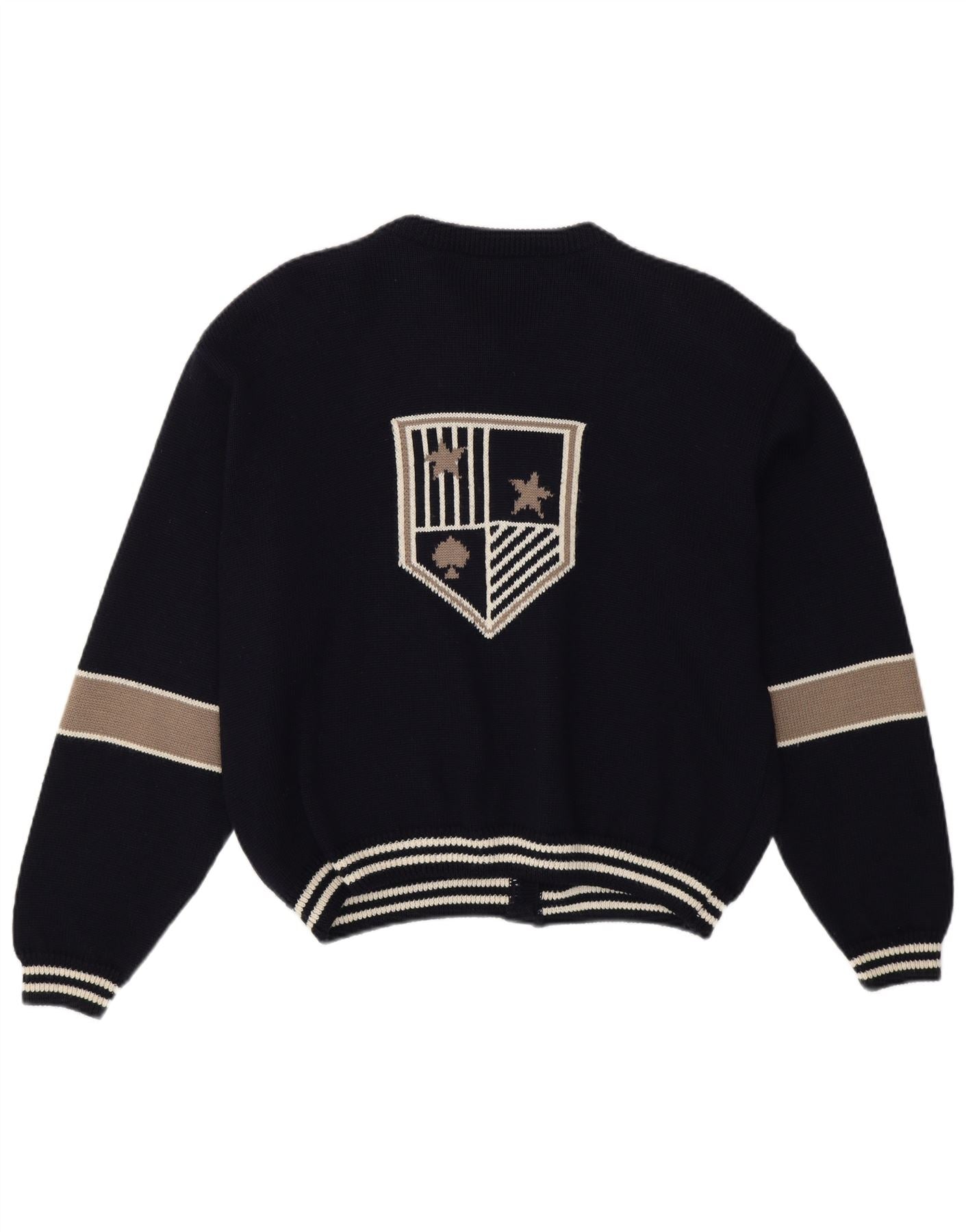 - KI-Beschreibung: Dieser Damen-Cardigan-Pullover von St. Michael ist aus einem marineblauen Wollmischstrick gefertigt und bietet ein weiches und dennoch strukturiertes Tragegefühl. Es verfügt über einen klassischen Rundhalsausschnitt und eine durchgehende Knopfleiste vorne. Die langen Ärmel sind mit Bündchen versehen und passen zum gerippten Saum. Ein markantes grafisches Wappen ziert Brust und Rücken und sorgt für einen adretten Touch. Kontrastierende Streifen an Ärmeln, Bündchen und Saum runden das Design ab. Die reguläre Passform sorgt für angenehmen Tragekomfort.