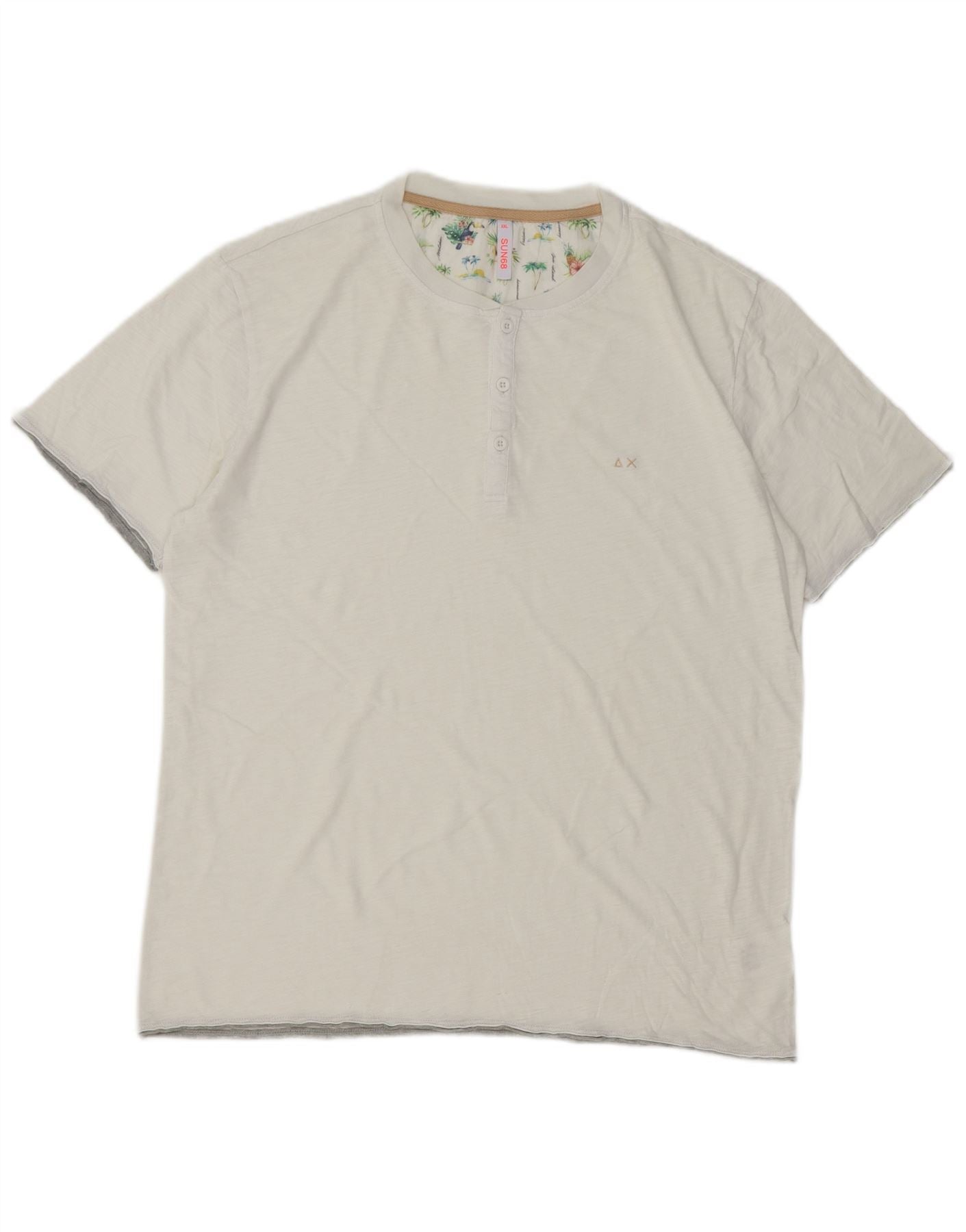 - KI-Beschreibung: Dieses T-Shirt-Oberteil für Herren von Sun68 ist aus weichem, cremefarbenem Jersey aus 100 % Baumwolle gefertigt. Es verfügt über einen klassischen Henley-Ausschnitt mit teilweiser Knopfleiste. Kurze Ärmel und eine reguläre Passform sorgen für angenehmen Tragekomfort. Ein dezentes Markendetail ziert die Brust. Der Innenkragen zeigt ein lebendiges Hawaii-Muster, das ihm eine einzigartige Note verleiht. Dieses vielseitige Oberteil bietet eine entspannte und dennoch raffinierte Ästhetik für den Alltagsstil.
