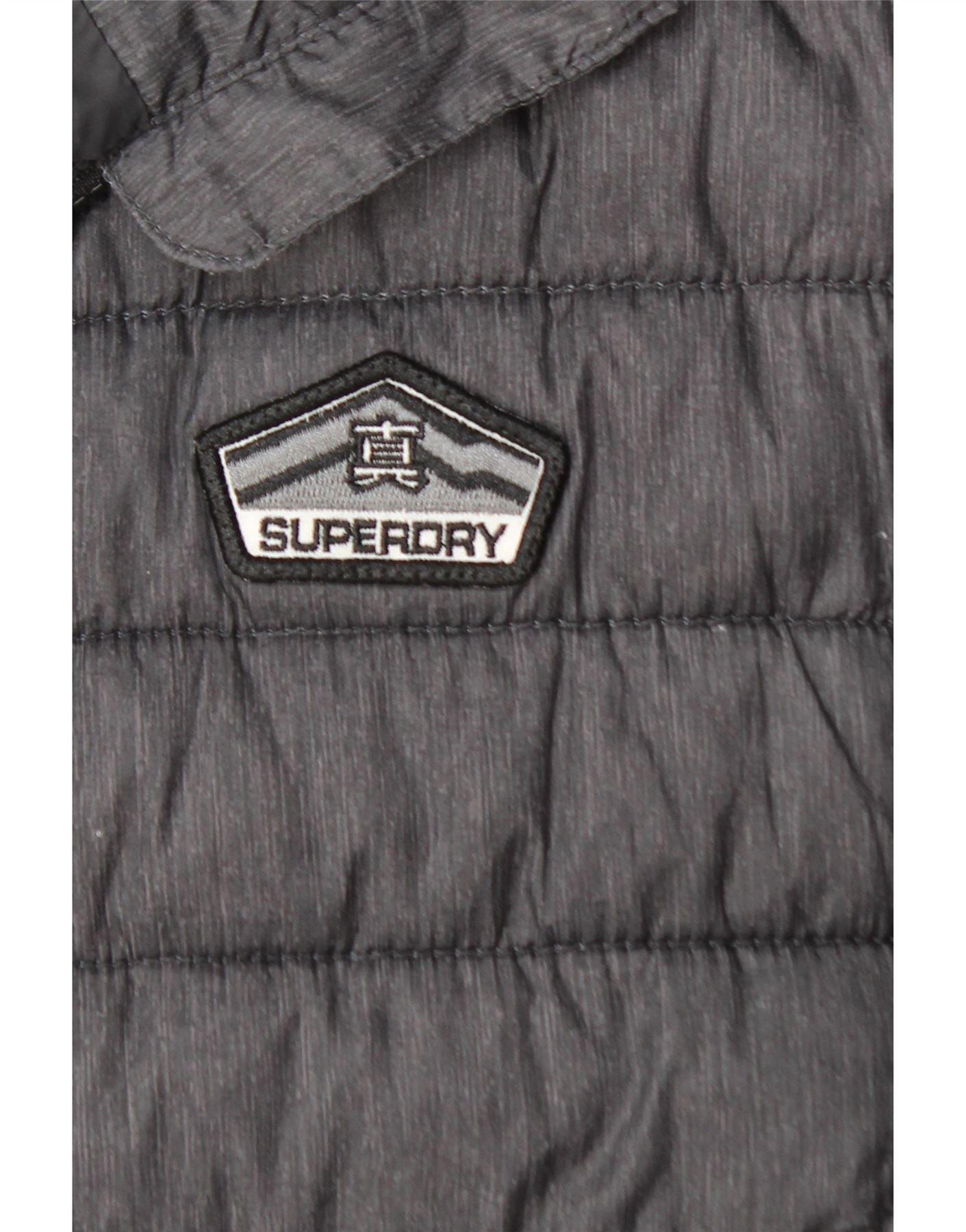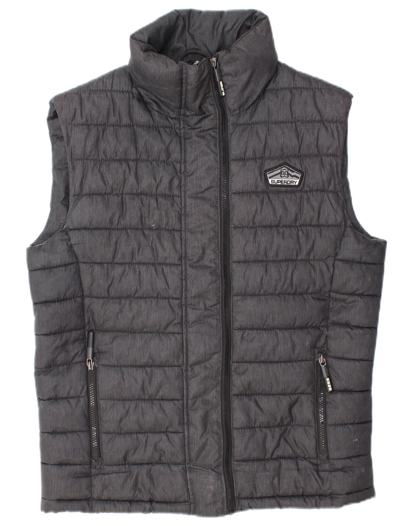 - AI Description: This Superdry men's waistcoat features a classic, quilted design in grey woven fabric. The regular fit ensures comfort and ease of movement. It has a collared neckline and a full zip closure. Zipped pockets offer secure storage. The padded construction provides extra warmth. A logo accent adds a signature touch. This sleeveless waistcoat is both practical and stylish.