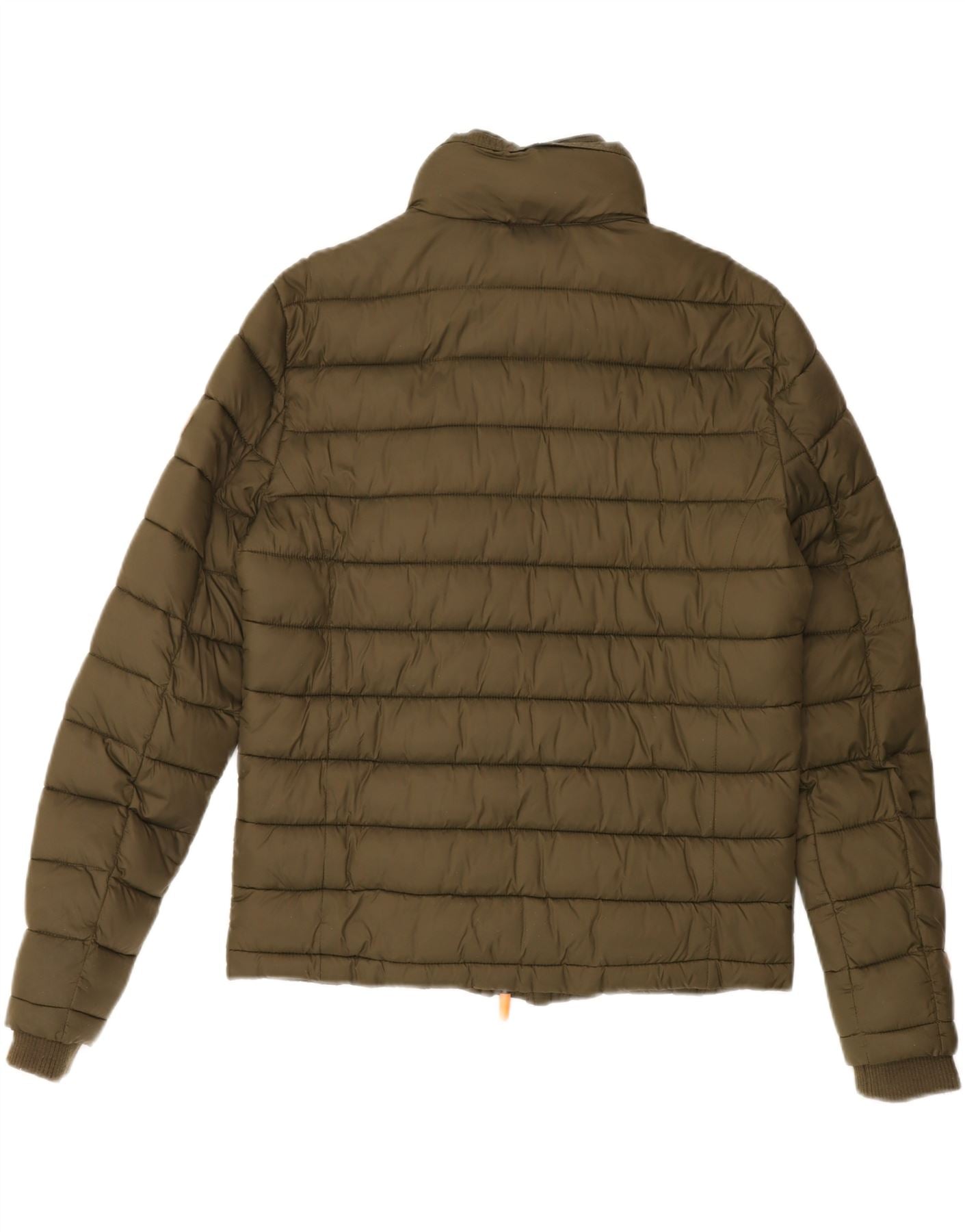 - AI Description: This pre-owned Superdry men's padded jacket offers modern style and warmth. In green, it features a regular fit, long sleeves, and a collared neckline. The woven fabric jacket has a full zip closure, zipped pockets, and a logo accent. Condition is excellent, with minor loose stitching on the collar, slight discoloration on the sleeves and moderate wear on the front zipper. Size M.