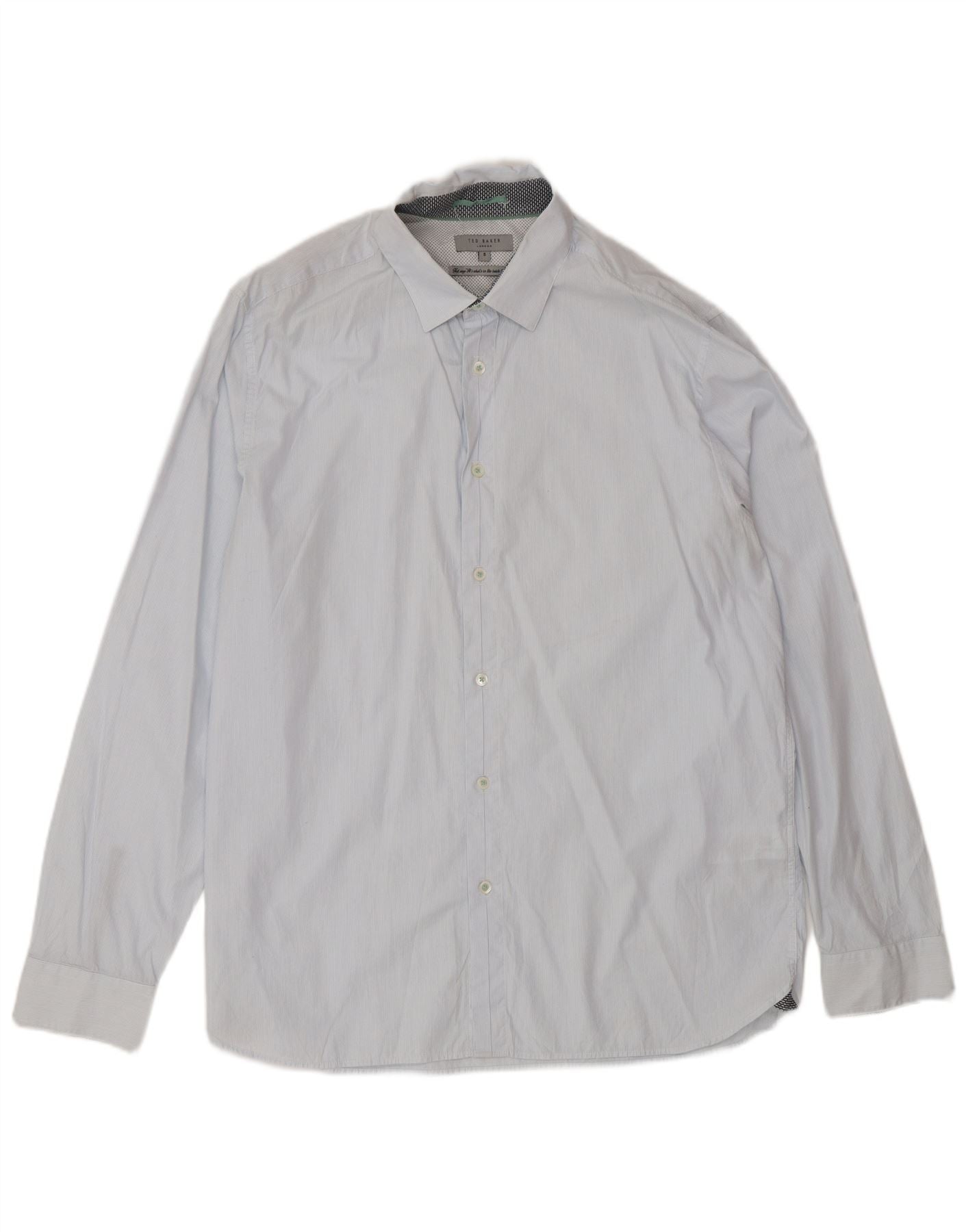 - KI-Beschreibung: Dieses Herrenhemd von Ted Baker ist aus 100 % gewebtem Baumwollstoff gefertigt. Es verfügt über ein dezentes blaues Streifenmuster. Der Kragenausschnitt und die durchgehende Knopfleiste vorne sorgen für einen klassischen Look. Lange Ärmel mit geknöpften Manschetten. Die reguläre Passform sorgt für angenehmen Tragekomfort. Die Kragendetails an der Innenseite sorgen für einen charakteristischen Touch. Dieses Hemd vereint zeitlosen Stil mit raffiniertem Komfort für jeden Anlass.