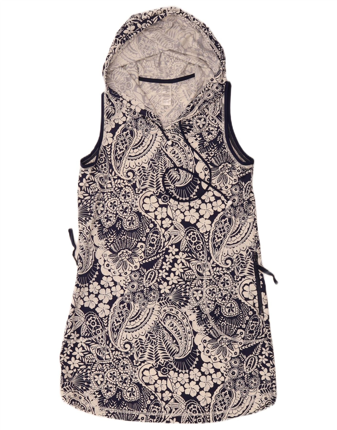 - KI-Beschreibung: Dieses Damen-Kapuzenkleid von Tommy Bahama ist aus einer weichen Polyester-Jersey-Mischung gefertigt. Es verfügt über ein lebendiges, mehrfarbiges Paisley-Muster, überwiegend Marineblau und Weiß. Das ärmellose Design bietet eine entspannte Passform. Es verfügt über eine praktische Kapuze und praktische Taschen. Der Pullover-Stil sorgt für einfaches Tragen. Dieses Kleid mit normaler Passform verkörpert eine Bohème-Ästhetik.