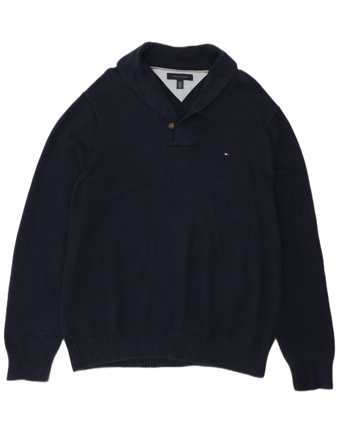 - KI-Beschreibung: Dieser Herrenpullover mit Schalkragen von Tommy Hilfiger ist aus 100 % Baumwollstrick gefertigt und bietet ein angenehmes und atmungsaktives Tragegefühl. Es verfügt über einen markanten Schalkragen mit Knopfverschluss am Hals. Lange Ärmel und eine normale Passform sorgen für eine klassische Silhouette. Die satte marineblaue Farbe wird durch einen dezenten gestickten Logo-Akzent ergänzt. Gerippte Bündchen und Saum runden das Design ab und sorgen für einen eleganten, adretten Look.
