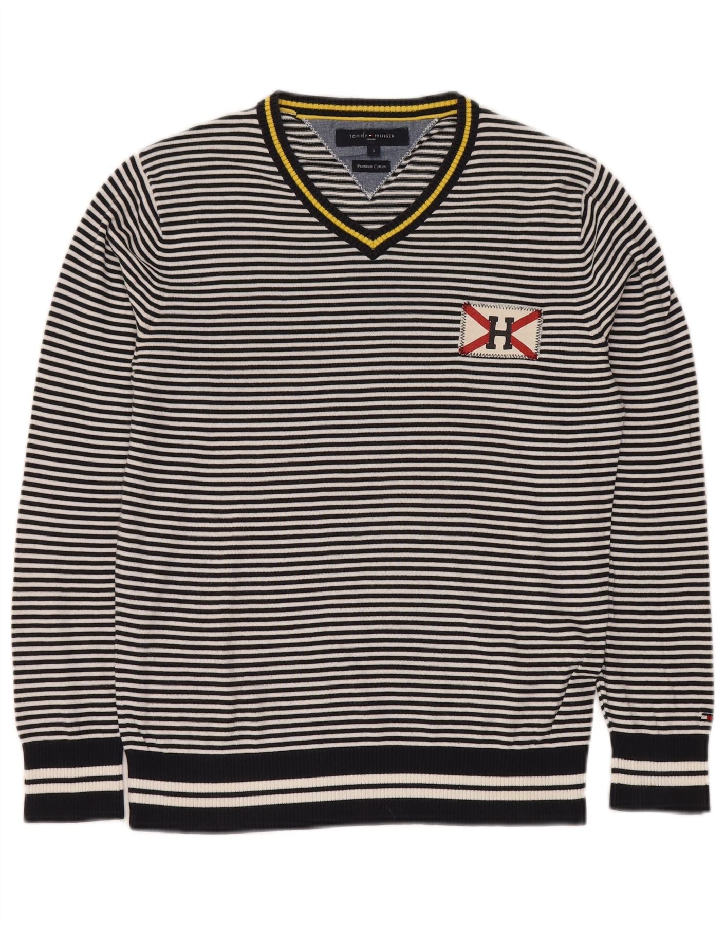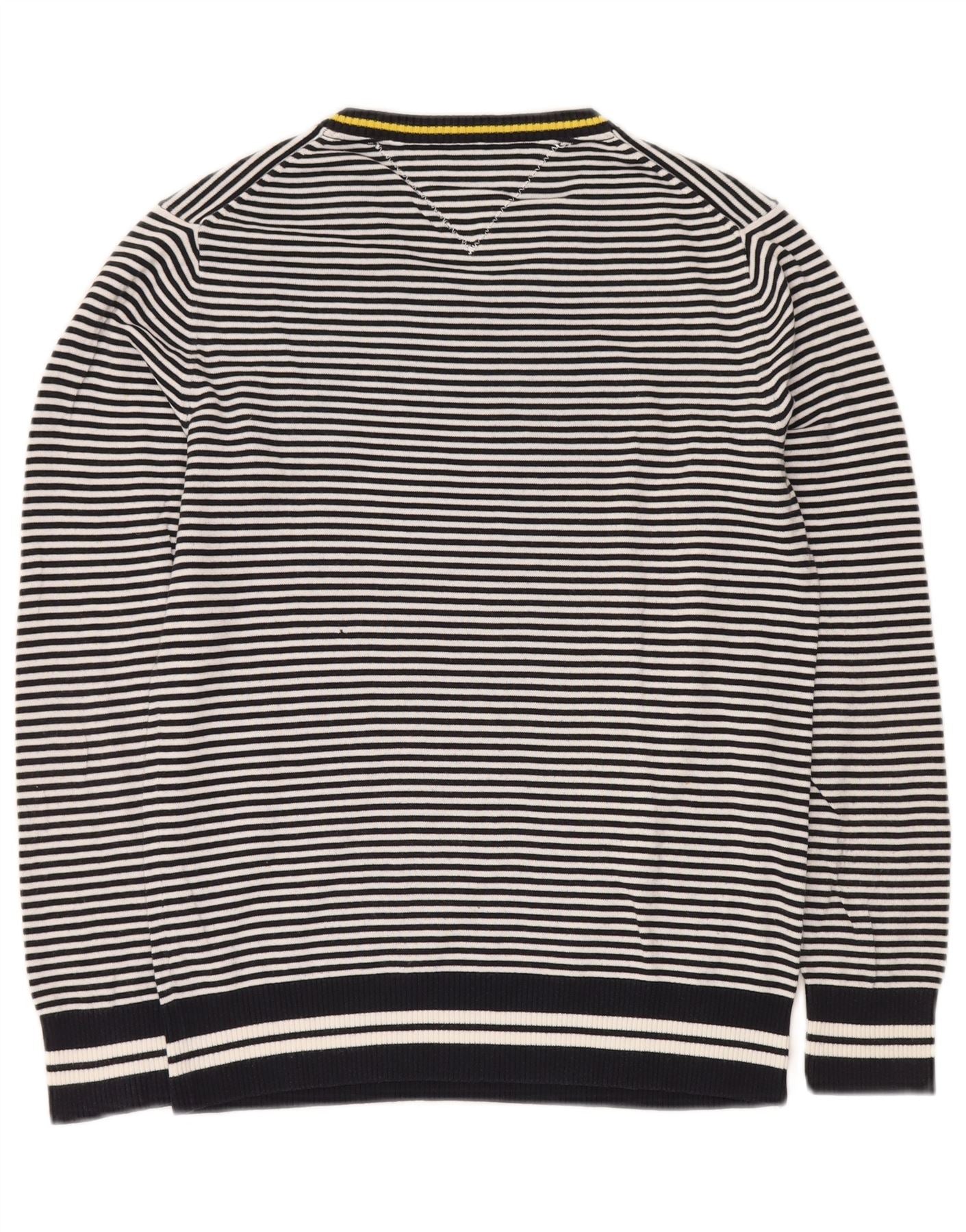 TOMMY HILFIGER Herren-Pullover mit V-Ausschnitt, klein, marineblau, gestreift, Baumwolle