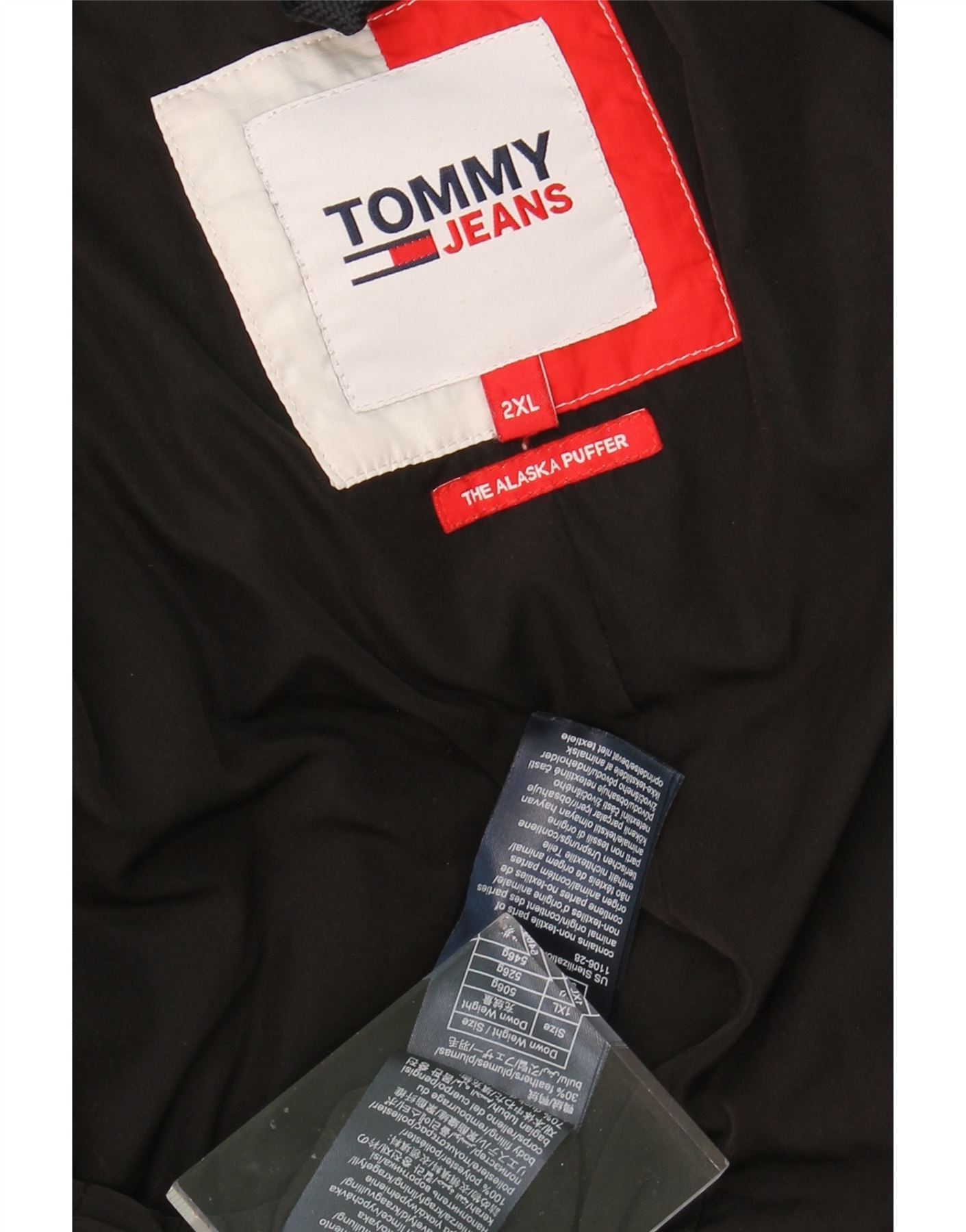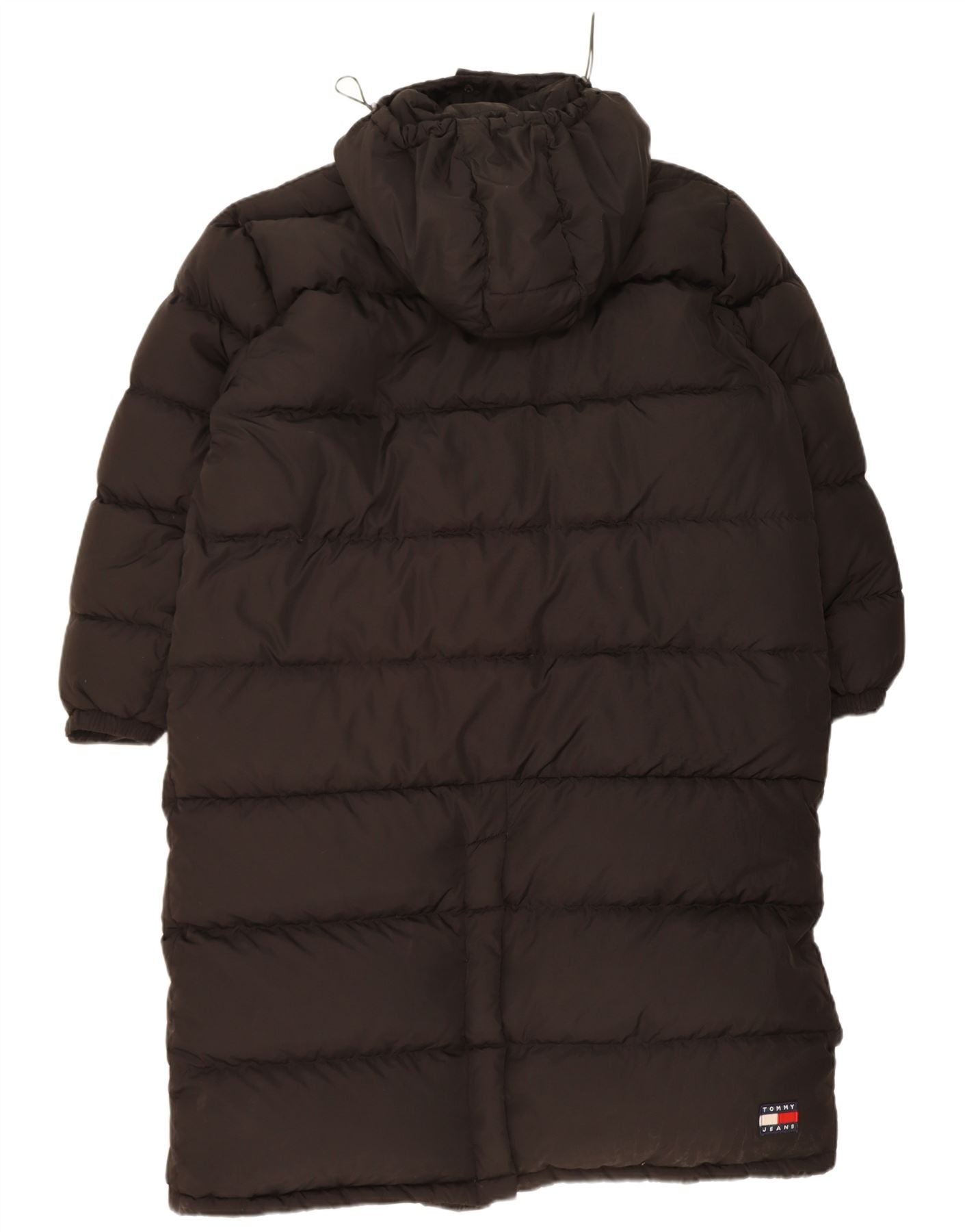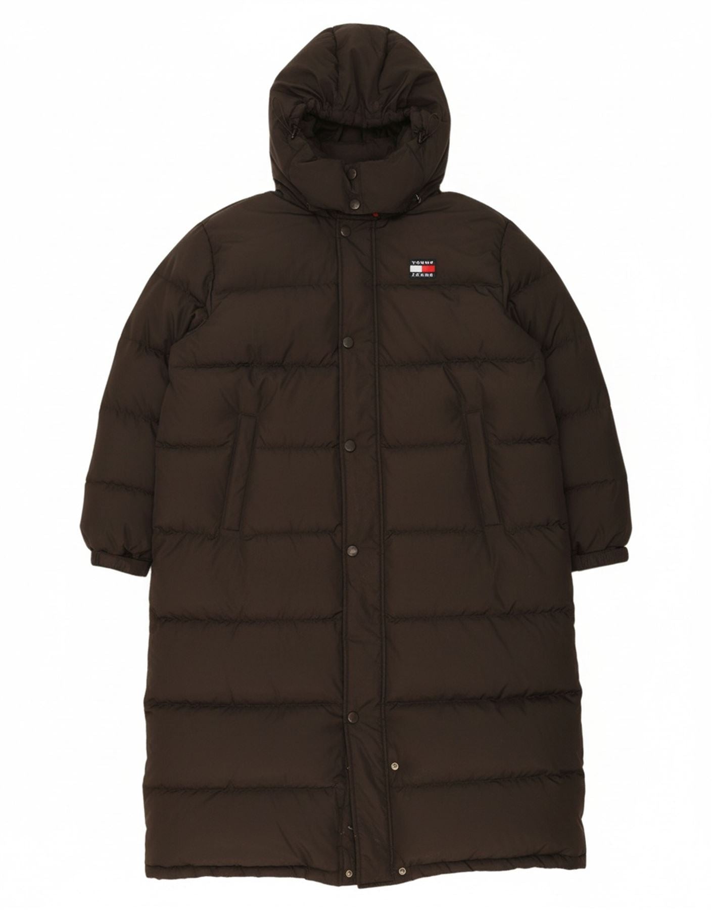 - AI Description: This Tommy Hilfiger women's padded coat is crafted from a luxurious black down blend, offering exceptional thermal warmth. Its oversized, relaxed fit provides ample coverage for winter. The full zip closure extends to a high neck, complementing the practical hooded design. Long sleeves ensure complete warmth. Multiple pockets offer functionality, and a subtle branded logo adds a signature touch.