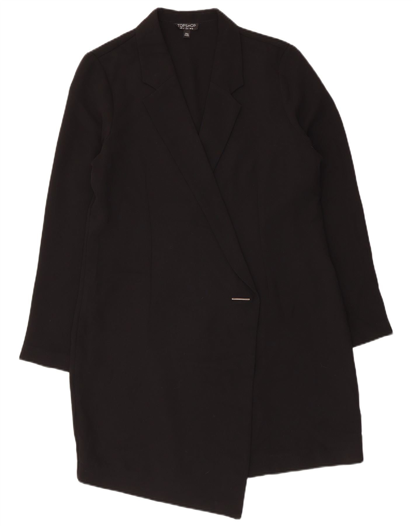 - KI-Beschreibung: Diese Damen-Blazerjacke von Topshop ist aus leichtem, schwarzem, gewebtem Polyester gefertigt. Es verfügt über ein modernes asymmetrisches Design mit Kragenausschnitt. Die Vorderseite im Wickelstil wird mit einem einzigen Knopf geschlossen. Lange Ärmel runden die Regular-Fit-Silhouette ab. Seine klaren Linien und die leichte Haptik sorgen für einen modernen, vielseitigen Look.