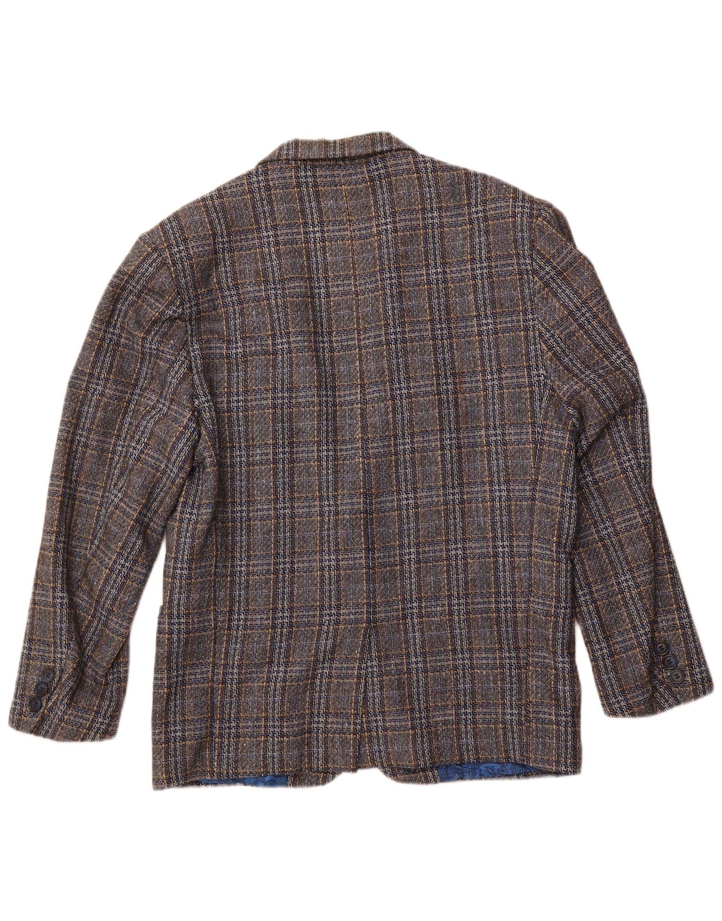 - KI-Beschreibung: Diese zweiteilige Herrenanzugjacke von Walter Babini ist aus einem edlen Wollmischstoff gefertigt. Es zeigt ein klassisches mehrfarbiges Karomuster in Grau-, Braun- und Blautönen. Der Kragenausschnitt und der Ein-Knopf-Verschluss sorgen für einen raffinierten, traditionellen Look. Lange Ärmel und eine reguläre Passform sorgen für angenehmen Tragekomfort. Praktische Taschen sorgen für funktionale Details. Ein leuchtend blaues Paisley-Futter sorgt für einen auffälligen inneren Kontrast.
