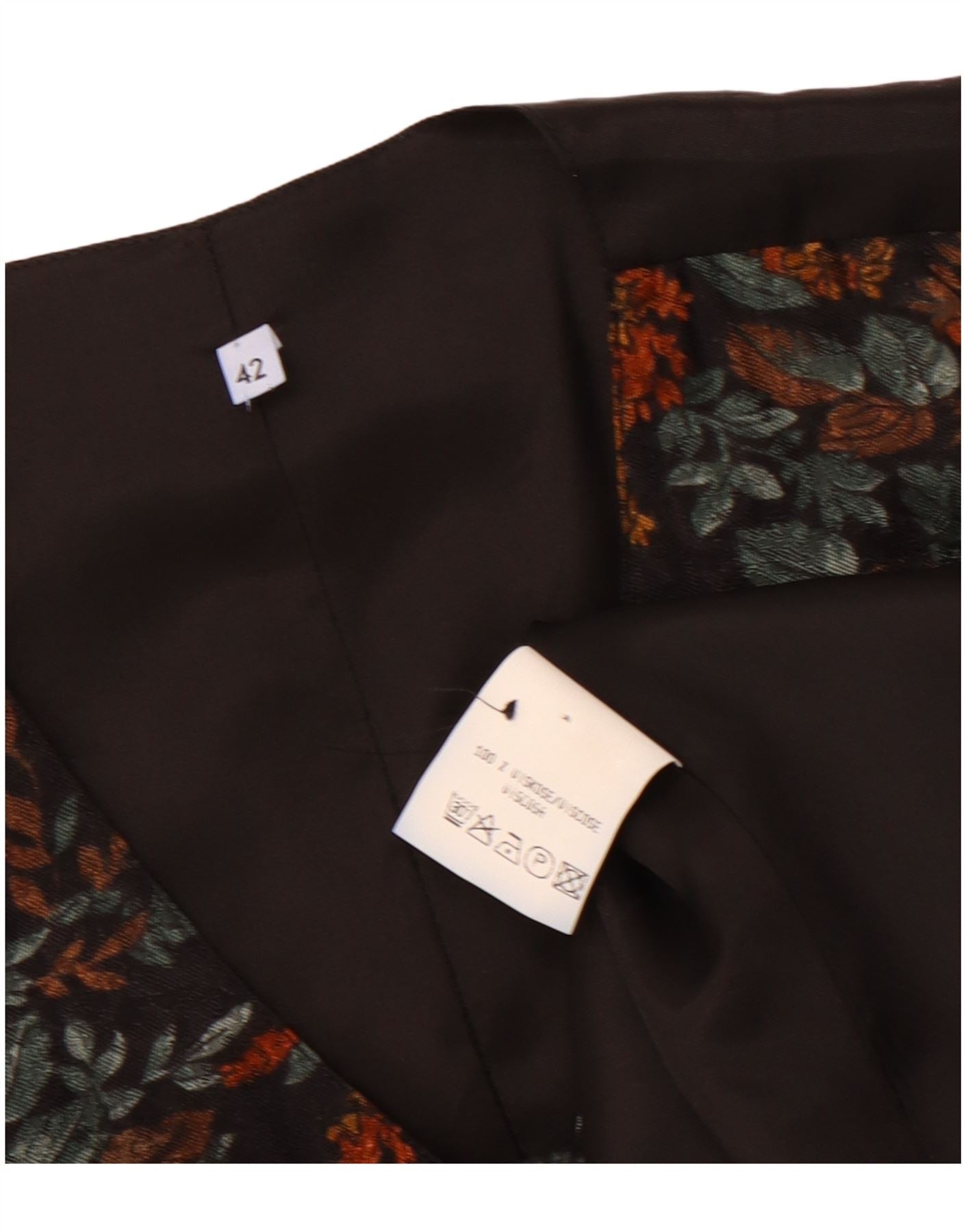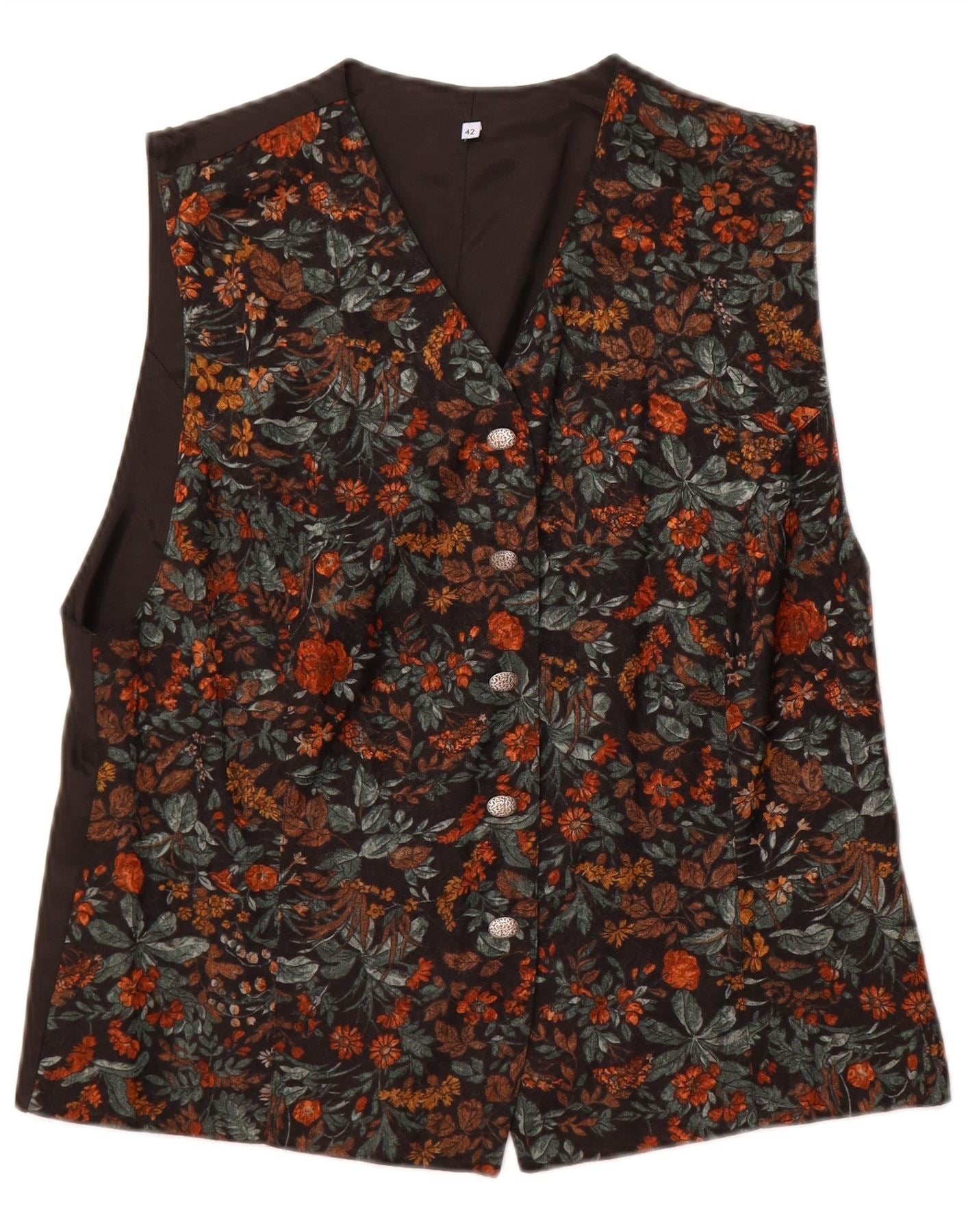 - KI-Beschreibung: Diese Vintage-Herrenweste ist zu 100 Prozent aus Viskose gefertigt und bietet eine glatte, gewebte Textur. Es verfügt über ein sattes, mehrfarbiges Blumenmuster vor einem dunklen Hintergrund mit Schwarz-, Grün- und Orangetönen. Der klassische V-Ausschnitt und das ärmellose Design sorgen für eine traditionelle Silhouette. Ein Fünf-Knopf-Verschluss vorne sorgt für eine ordentliche, normale Passform. Dieses Stück bietet mit seinen aufwendigen Details zeitlosen Stil.