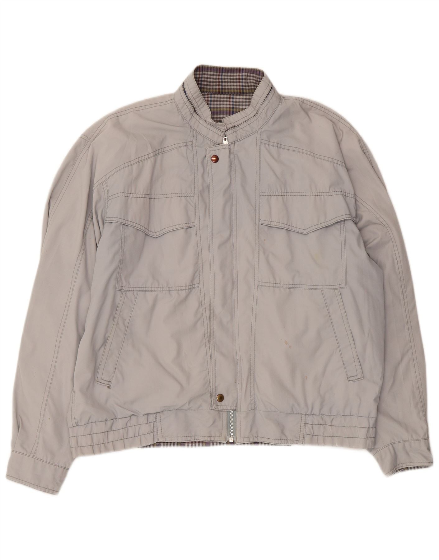 - KI-Beschreibung: Diese Vintage-Bomberjacke für Herren ist aus einem grauen, gewebten Stoff gefertigt und bietet ein glattes und dennoch strapazierfähiges Tragegefühl. Es verfügt über einen klassischen Kragenausschnitt und lange Ärmel mit Bündchendetails. Der durchgehende Reißverschluss sorgt für einen sicheren Sitz. Eine reguläre Passform sorgt für angenehmen Tragekomfort. Vordertaschen mit Knopfakzenten sorgen für praktischen Stil. Die Jacke ist wendbar und zeigt auf der Innenseite ein dezentes Karomuster.