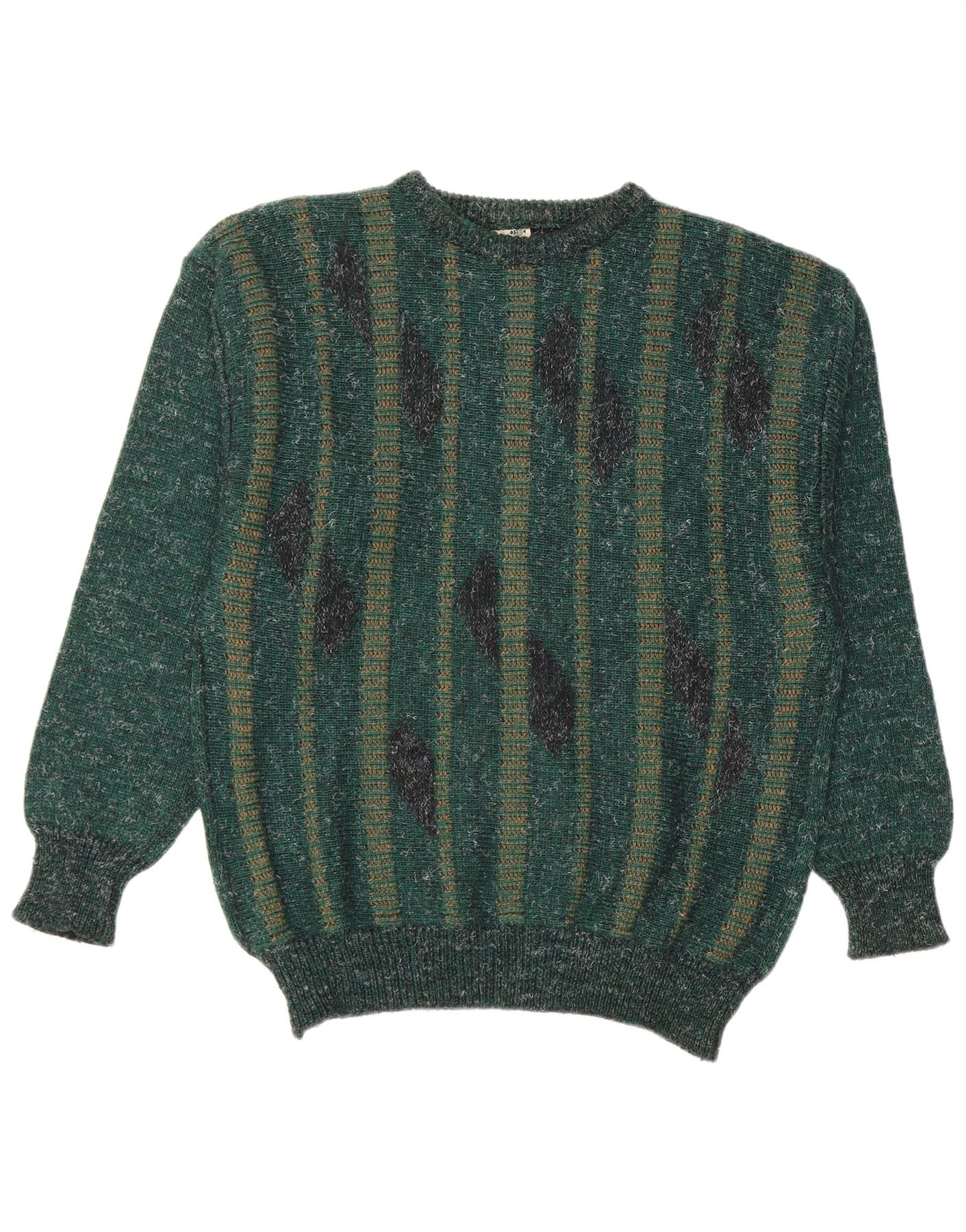 - KI-Beschreibung: Dieser Vintage-Herrenpullover mit Rundhalsausschnitt ist aus einer bequemen Acryl-Polyamid-Strickmischung gefertigt. Es verfügt über eine satte grüne Basis mit einem abstrakten Streifenmuster in dunkleren Tönen. Der klassische Rundhalsausschnitt und die langen Ärmel sorgen für eine zeitlose Silhouette. Bündchen an Handgelenken und Saum sorgen für einen gepflegten Abschluss. Die reguläre Passform sorgt für Komfort und Tragekomfort. Dieser Pulloverstil bietet eine Retro-Ästhetik.