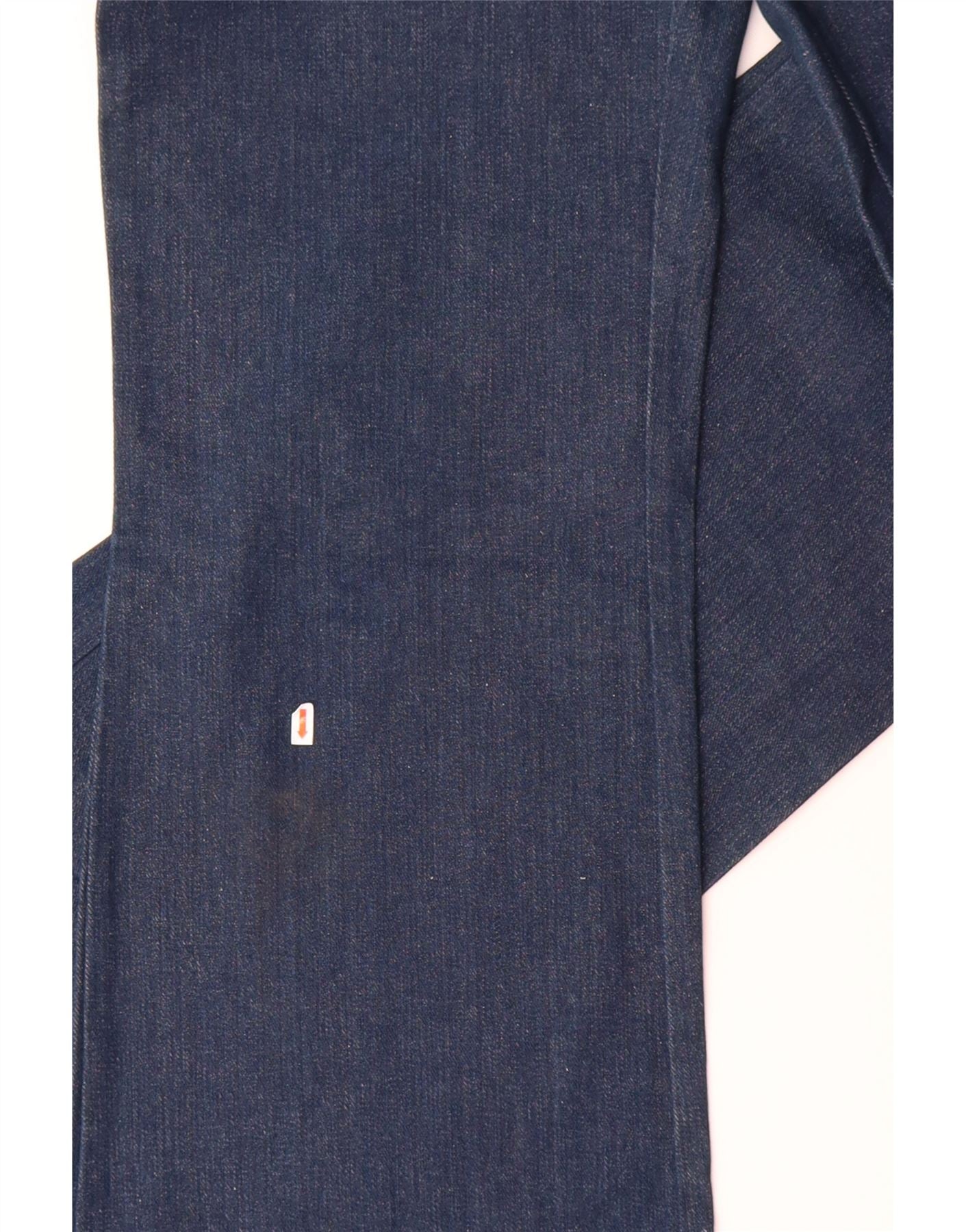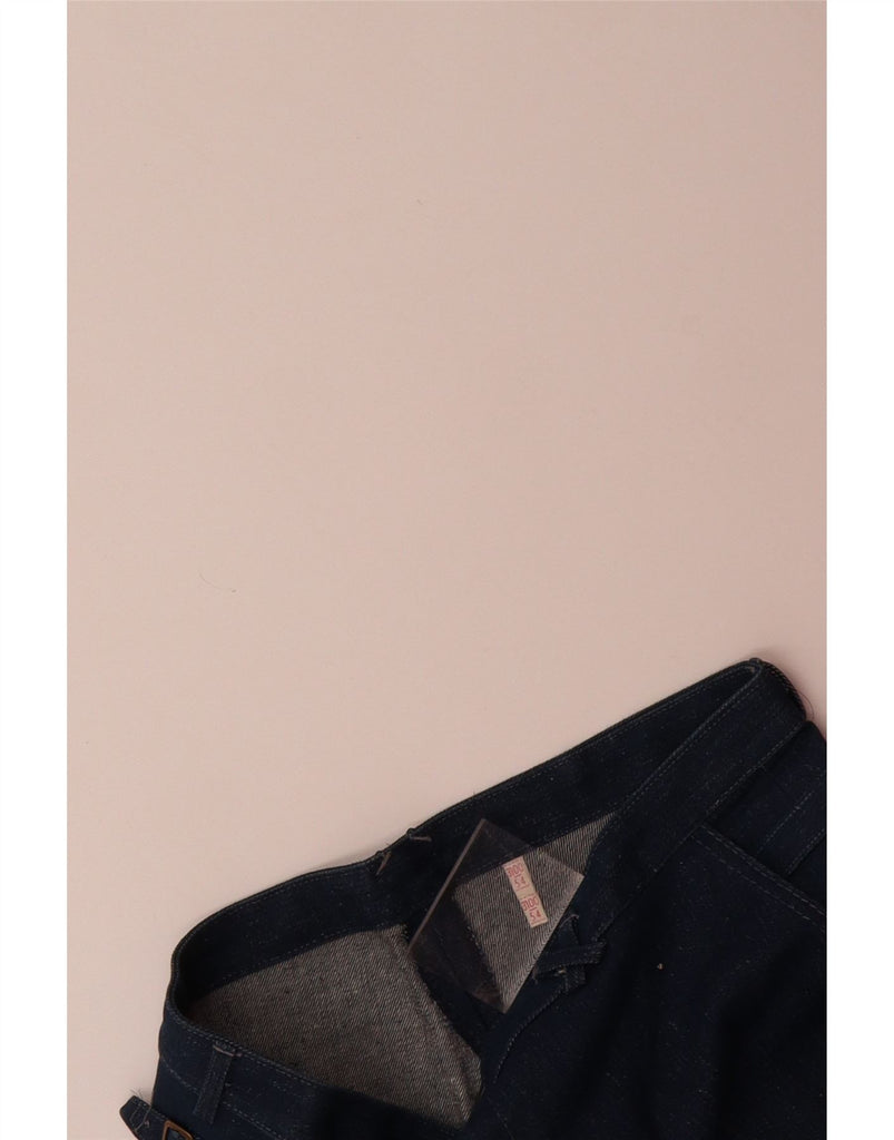 - AI Description: These Vintage mens flared jeans are crafted from sturdy navy blue denim. They feature a classic flared leg silhouette, offering a retro style. The regular fit ensures comfortable wear. A zip closure provides a neat front. Functional pockets add practicality. An adjustable waist with buckle detail allows for a personalised fit, enhancing the vintage appeal.