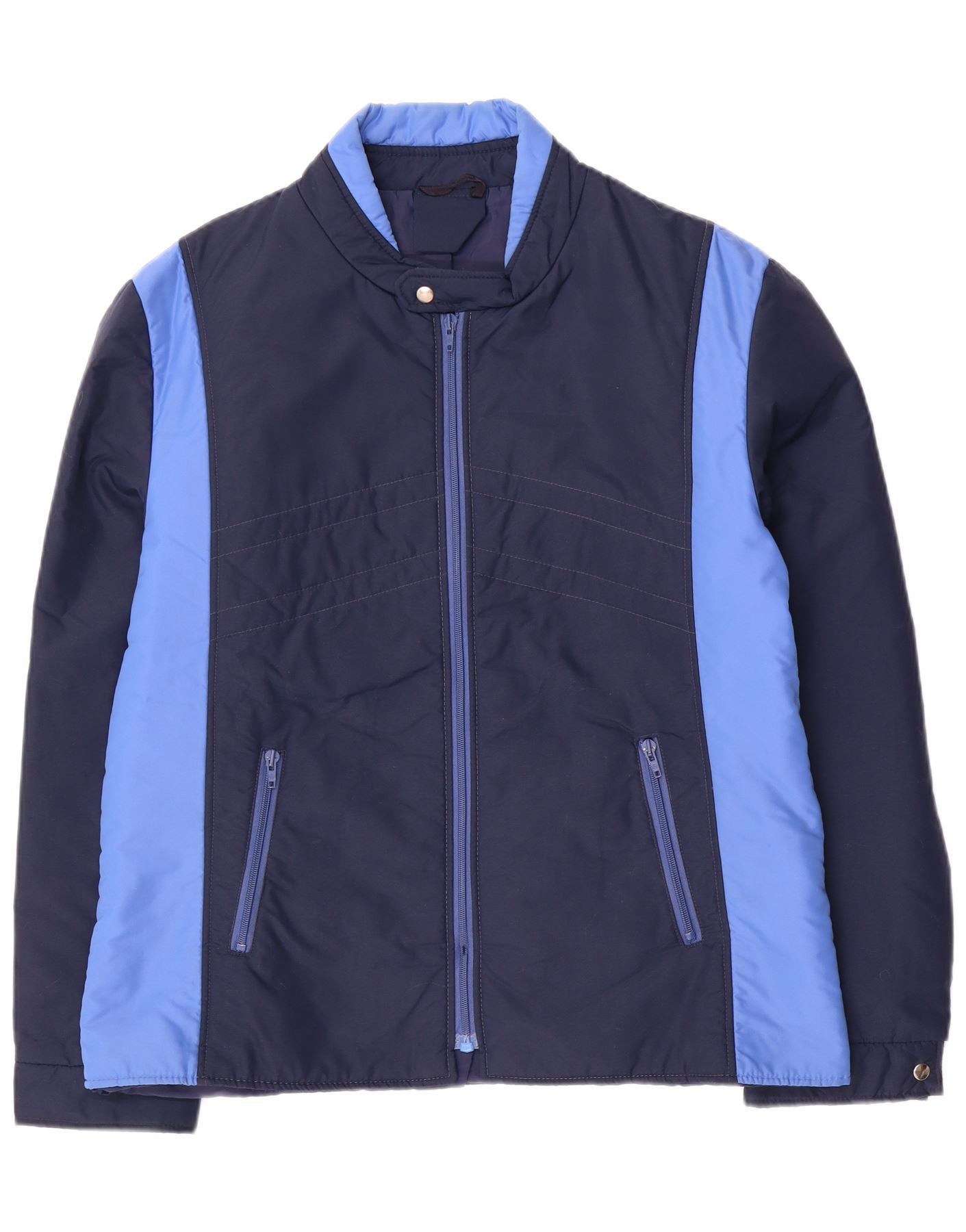- KI-Beschreibung: Diese Vintage-Windbreakerjacke für Herren ist aus leichter 100-Polyamid-Mikrofaser gefertigt. Es verfügt über ein auffälliges Farbblockmuster in Marineblau und Hellblau. Der hohe Kragen und der durchgehende Reißverschluss sorgen für eine klassische Bomber-Passform. Lange Ärmel und praktische Taschen unterstreichen das funktionale Design. Diese Jacke mit normaler Passform verkörpert einen Retro-Stil und eignet sich perfekt für den Alltag.