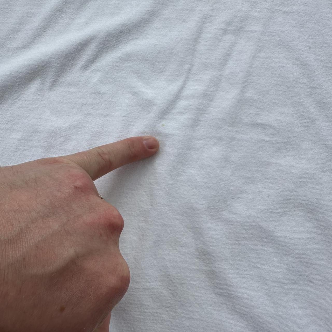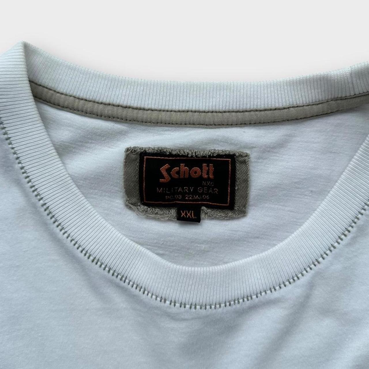Weißes Vintage-T-Shirt mit Spruch von Schott aus den frühen 2000ern mit aufgedrucktem und gesticktem Spruch auf der Brust