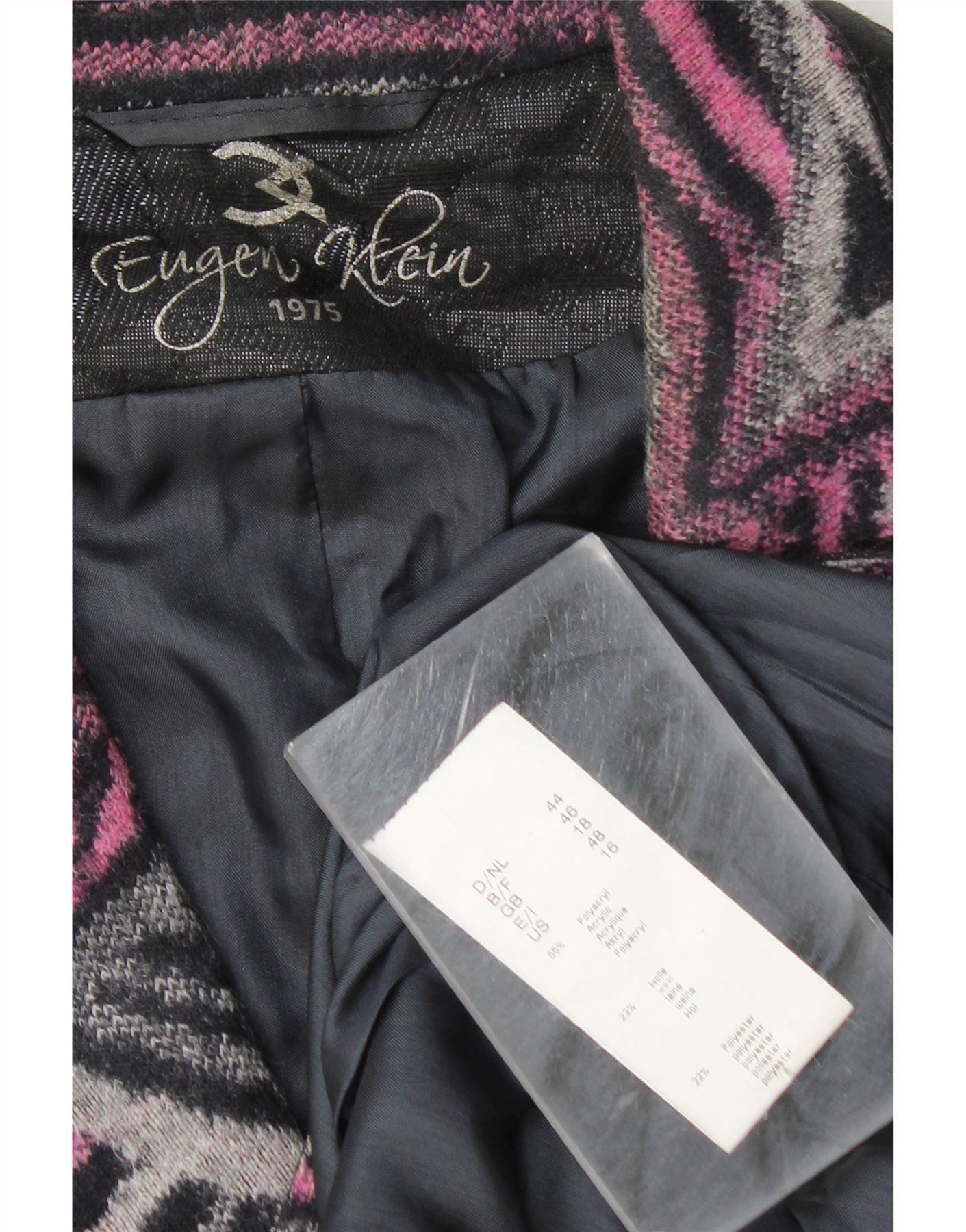- KI-Beschreibung: Diese Damenjacke von Eugen Klein ist aus einem Mischgewebe mit einem auffälligen mehrfarbigen geometrischen Muster gefertigt. Die Strickstruktur kombiniert Rosa-, Schwarz- und Grautöne für ein Retro-Feeling. Es verfügt über einen klassischen Kragenausschnitt und lange Ärmel. Die Vorderseite wird mit einem einzigen Knopf geschlossen und durch dezente Taschen ergänzt. Die Jacke ist vollständig gefüttert und bietet eine bequeme und strukturierte reguläre Passform.