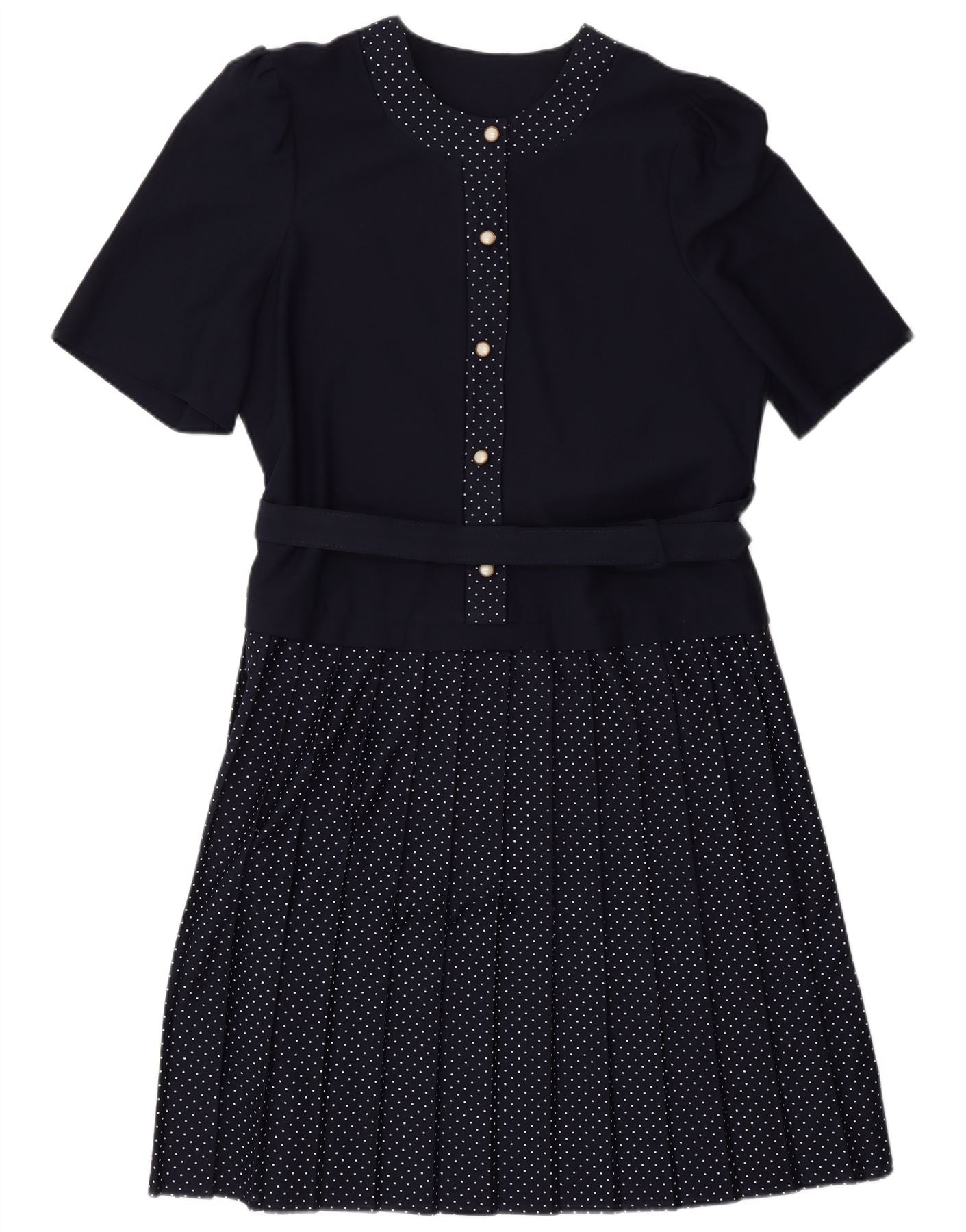 VINTAGE Damen A-Linien-Kleid UK 16 Großes marineblau gepunktetes Polyester