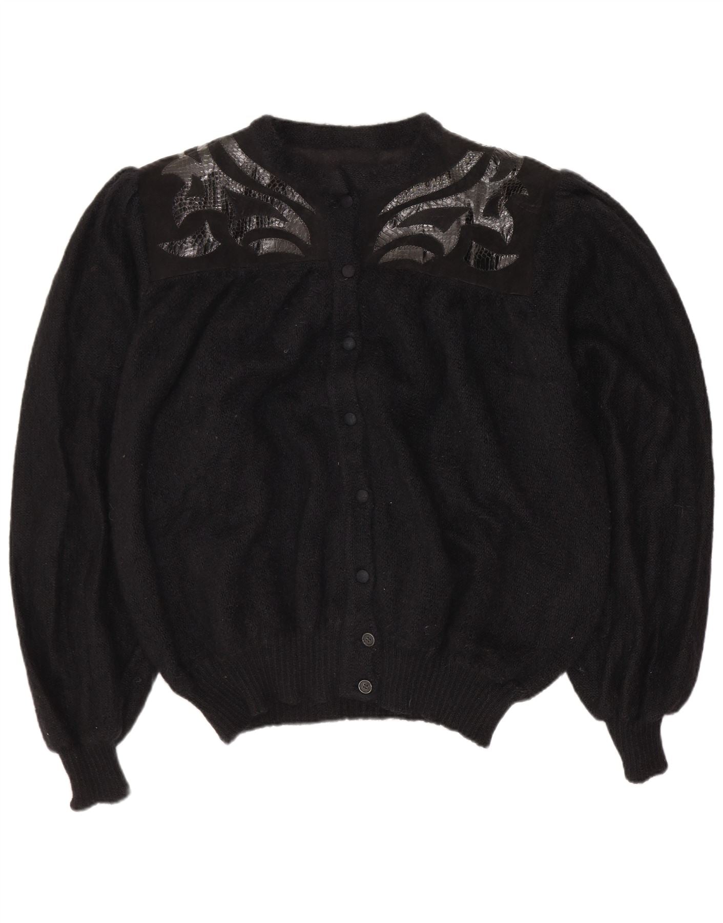 - KI-Beschreibung: Dieser Vintage-Cardigan für Damen ist aus einem feinen schwarzen Strickstoff gefertigt. Es verfügt über einen klassischen Rundhalsausschnitt und eine durchgehende Knopfleiste vorne. Die langen Ärmel werden an den Manschetten sanft gerafft. Die reguläre Passform bietet angenehmen Tragekomfort. Markante abstrakte Spitzendetails zieren die Schultern und verleihen diesem zeitlosen Stück einen Retro-Akzent und ein einzigartiges visuelles Interesse.