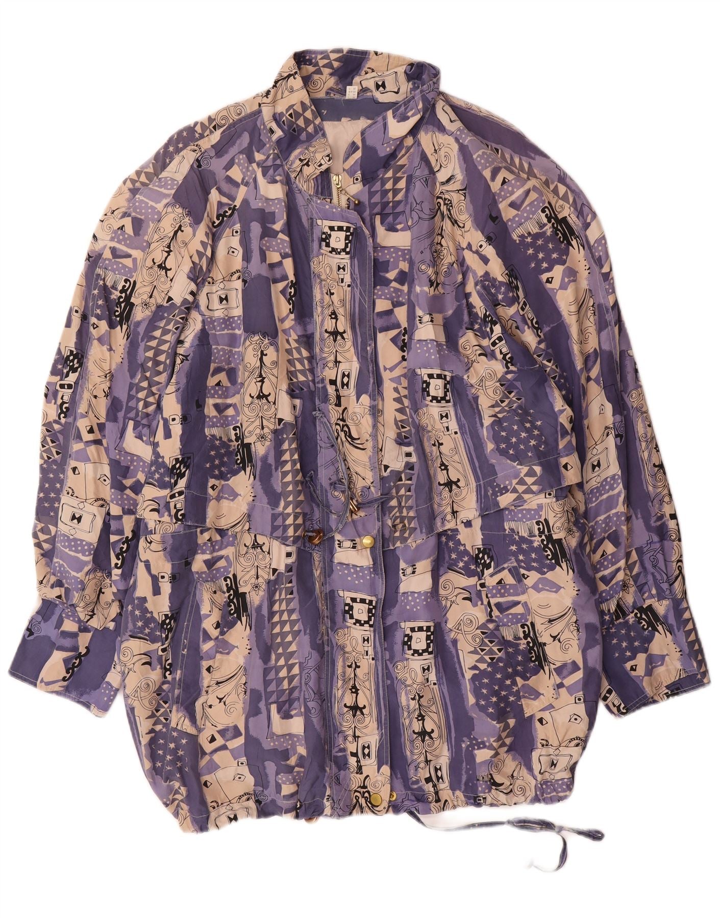- AI Description: This Vintage womens Windbreaker Jacket features a striking multicoloured geometric pattern. Crafted from a woven fabric, it offers a lightweight feel. The collared neckline and long sleeves provide classic coverage. A full zip closure and relaxed, loose fit ensure comfort and ease. Practical pockets and an adjustable waist add functional retro style.