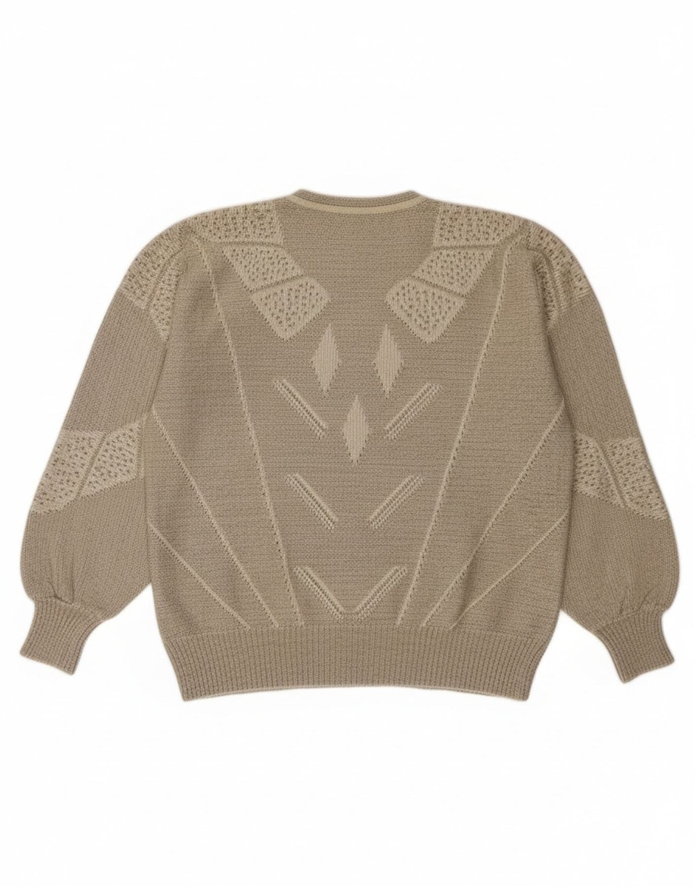 - KI-Beschreibung: Dieser Vintage-Damenpullover mit Reißverschluss am Hals ist aus beigem Strickstoff gefertigt. Es verfügt über eine entspannte Fledermaus-Passform mit langen Ärmeln. Der Rundhalsausschnitt verfügt über ein praktisches Reißverschlussdetail. Ein auffälliges geometrisches Muster ziert den Körper und die Ärmel. Dieser Retro-Stil bietet sowohl Dehnbarkeit als auch Komfort und sorgt so für ein angenehmes und stilvolles Tragegefühl.
