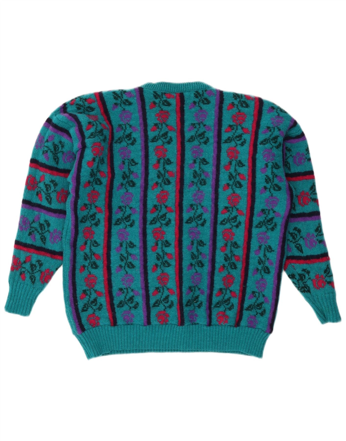 VINTAGE Damen-Pullover mit Rundhalsausschnitt, UK 16, große türkisfarbene Wolle mit Blumenmuster