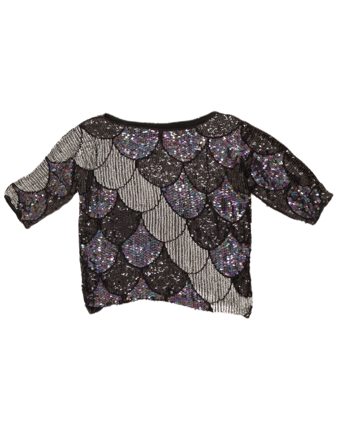 - KI-Beschreibung: Dieses Vintage-T-Shirt-Oberteil für Damen ist aus einem Mischgewebe gefertigt und vollständig mit schimmernden Pailletten verziert. Es verfügt über ein auffälliges geometrisches Muster in Schwarz, Silber und schillernden Mehrfarbentönen. Der Rundhalsausschnitt und die kurzen Ärmel sorgen für eine klassische Silhouette. Die verkürzte Länge und die normale Passform sorgen für ein stilvolles und angenehmes Tragegefühl. Dieses Stück verkörpert die Ästhetik der 80er Jahre und ist perfekt für einen Statement-Look.