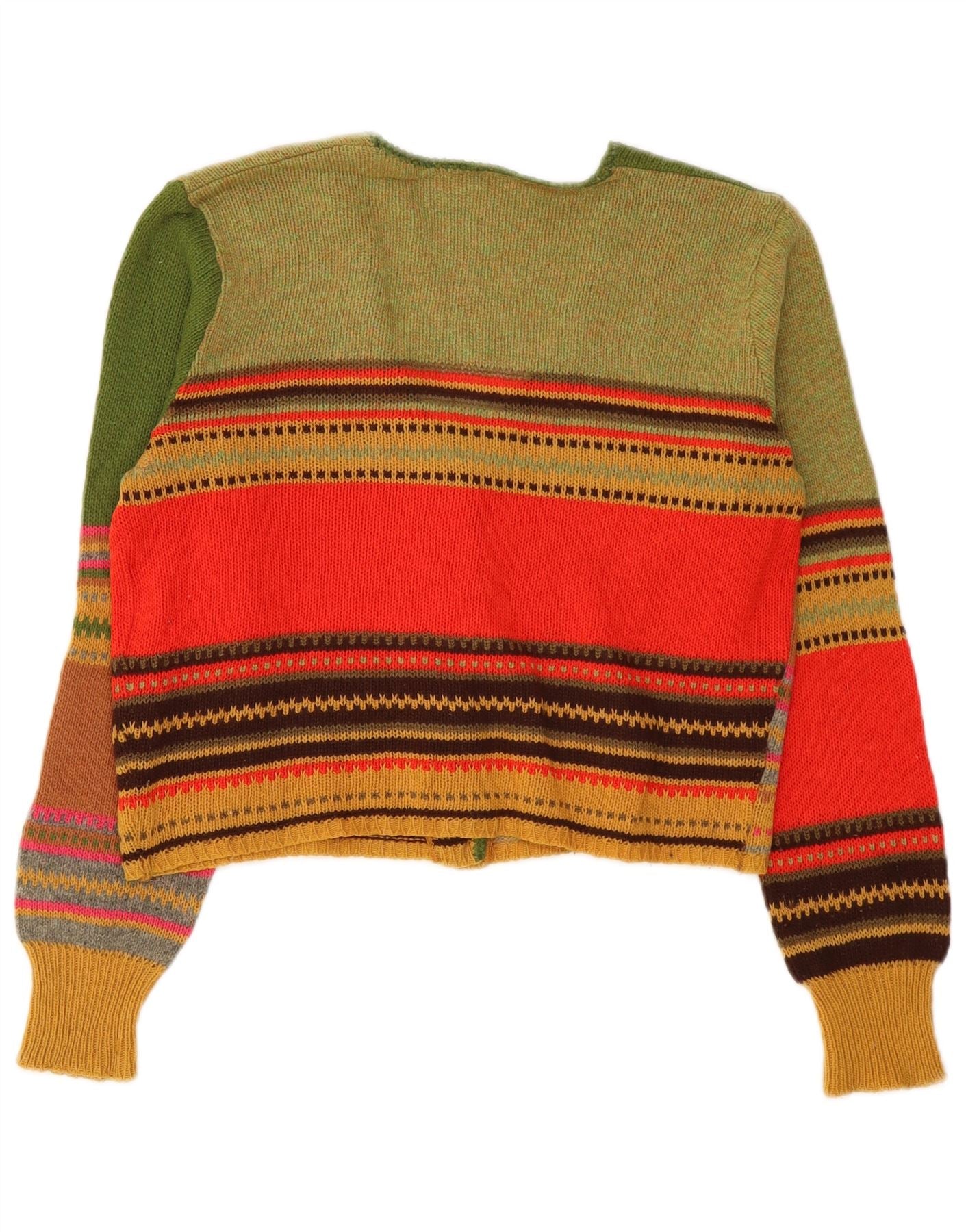 - KI-Beschreibung: Dieser Vintage-Cardigan für Damen ist aus einem weichen Strickstoff gefertigt. Es verfügt über ein lebendiges, mehrfarbiges Patchwork-Muster, das Grün-, Rot- und Orangetöne kombiniert. Der V-Ausschnitt und die Knopfleiste vorne sorgen für eine klassische Silhouette. Lange Ärmel enden in hübschen Manschetten. Die verkürzte Länge und die normale Passform sorgen für ein stilvolles und angenehmes Tragegefühl. Ton-in-Ton-Knöpfe runden das Design ab.