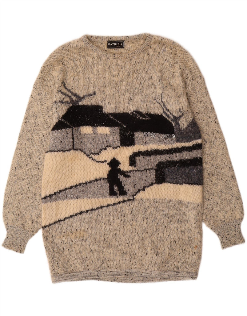 VINTAGE Damen Pullover mit grafischem Rundhalsausschnitt, Gr. 16, groß, grau meliert