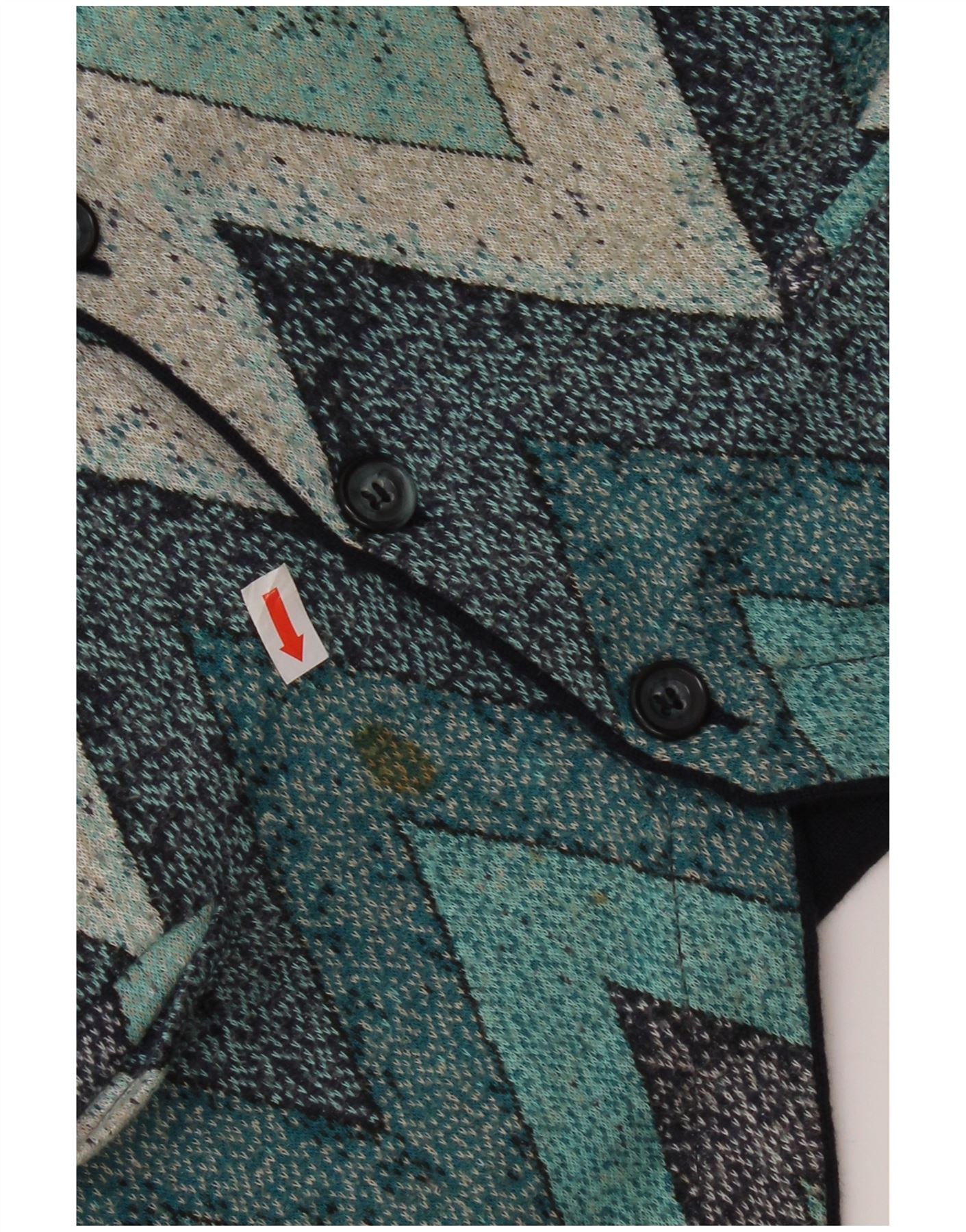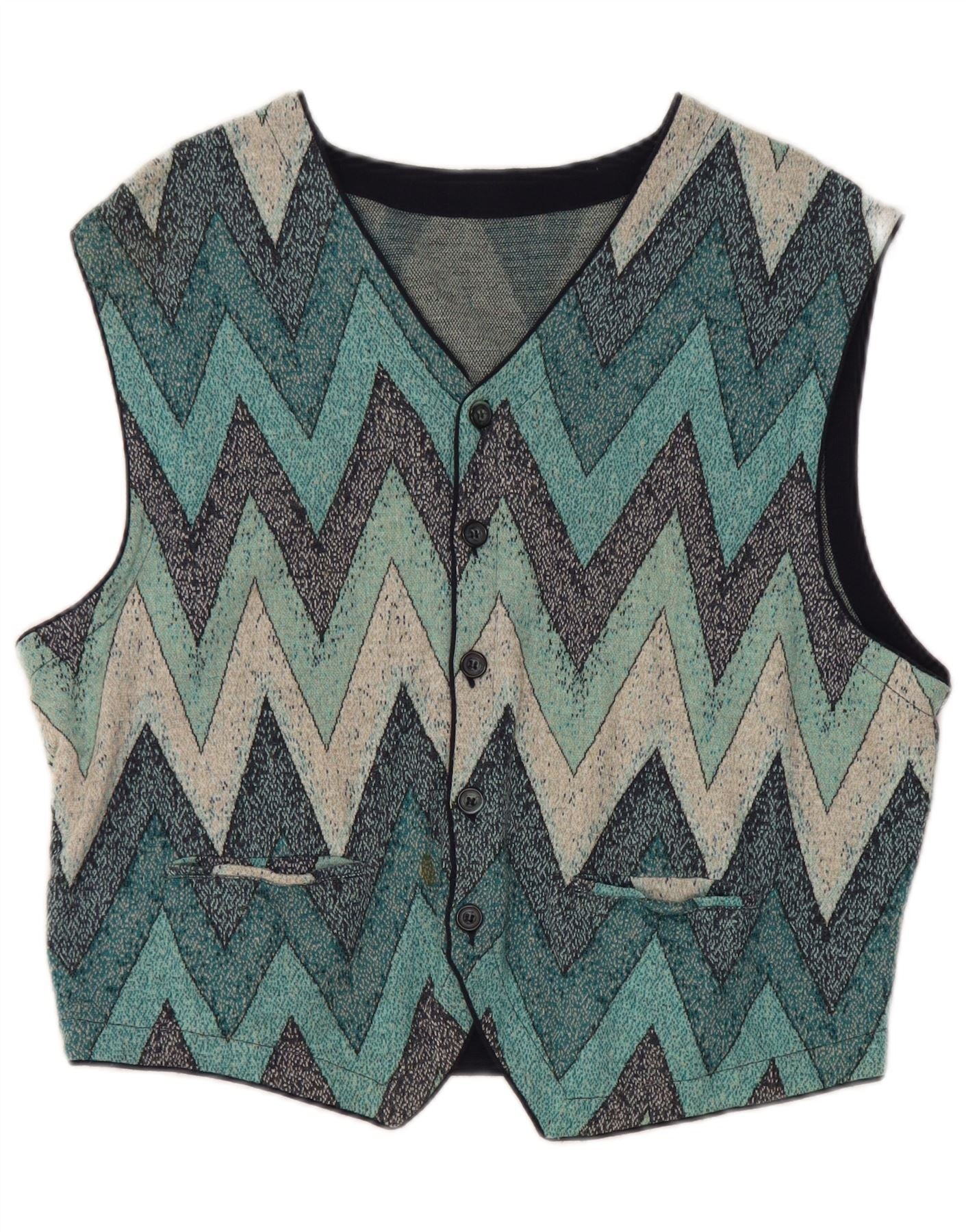 - KI-Beschreibung: Diese Vintage-Damenweste ist aus leichtem Rayon-Baumwollstrick gefertigt. Es verfügt über ein auffälliges Chevron-Muster in Blau-, Grau- und Schwarztönen. Das ärmellose Design hat einen klassischen V-Ausschnitt und eine normale Passform. Drei Knöpfe vorne sorgen für den Verschluss, ergänzt durch dezente Taschen. Dieses Stück im Retro-Stil bietet eine unverwechselbare, bequeme Schicht.