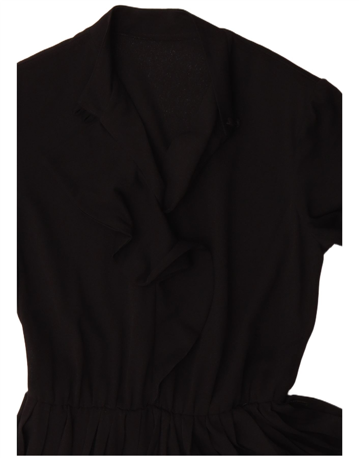 - KI-Beschreibung: Dieses Vintage-Damenkleid ist aus schwarzem Webstoff gefertigt. Es verfügt über einen Kragenausschnitt und lange Ärmel für eleganten Schutz. Das Pullover-Design verfügt über ein Rüschendetail am Oberteil. Ein elastischer Bund definiert die Silhouette und führt zu einem klassischen Faltenrock. Dieses Kleid mit normaler Passform bietet einen zeitlosen, strukturierten Look. Der Rüschenakzent verleiht einen Hauch von femininem Charme, perfekt für ein anspruchsvolles Ensemble.