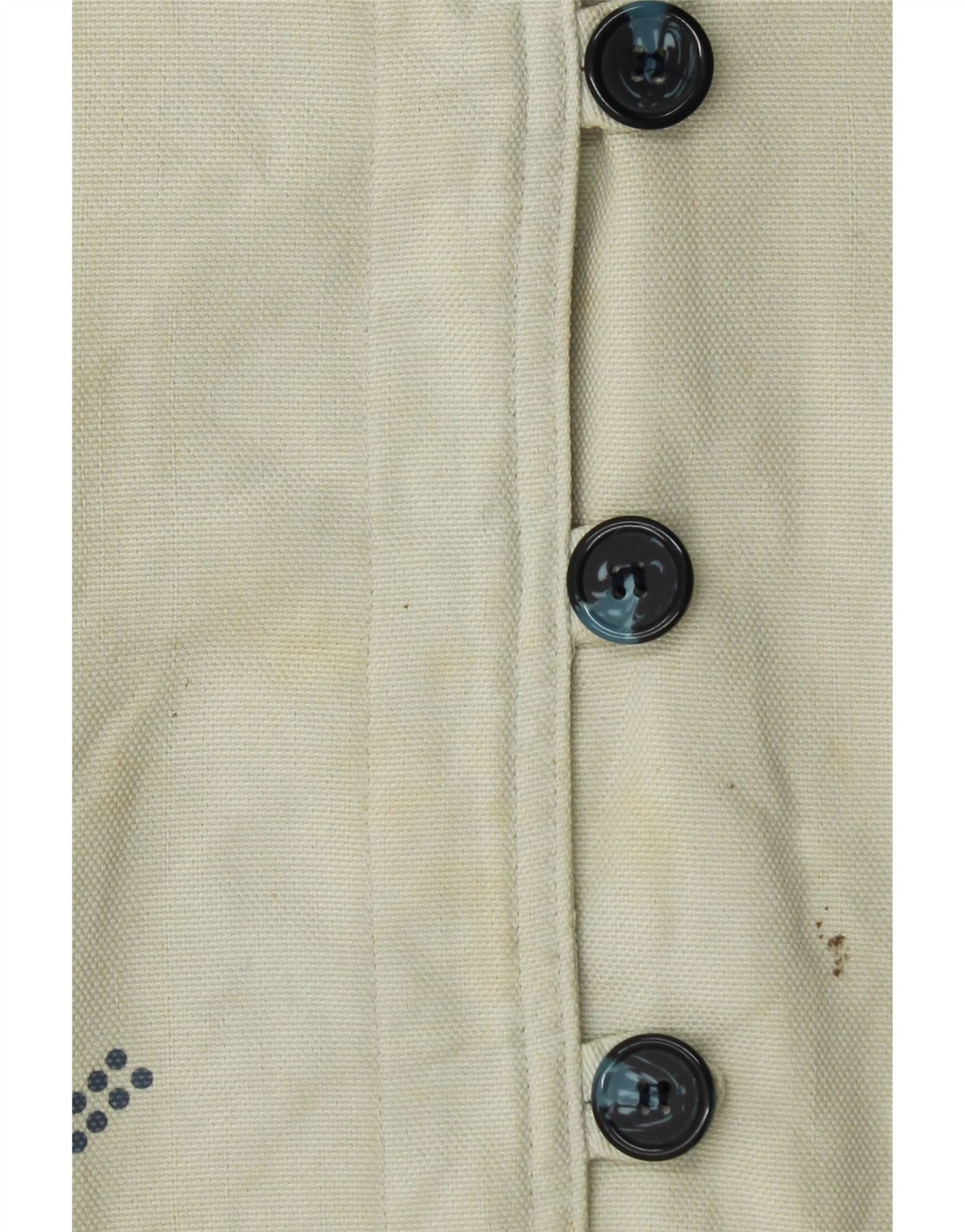 - KI-Beschreibung: Diese Vintage-Damenjacke ist aus 80 % gewebtem Baumwollstoff in einem cremefarbenen Farbton gefertigt. Es hat einen Kragenausschnitt und lange Ärmel. Die reguläre Passform bietet angenehmen Tragekomfort. Ein geometrisches Muster mit Blau- und Grautönen ziert die Ärmel und den Saum. Gestickte Akzente betonen die Vorderseite. Fünf Knopfverschlüsse runden das Design ab und verleihen ihm einen ethnischen Touch.