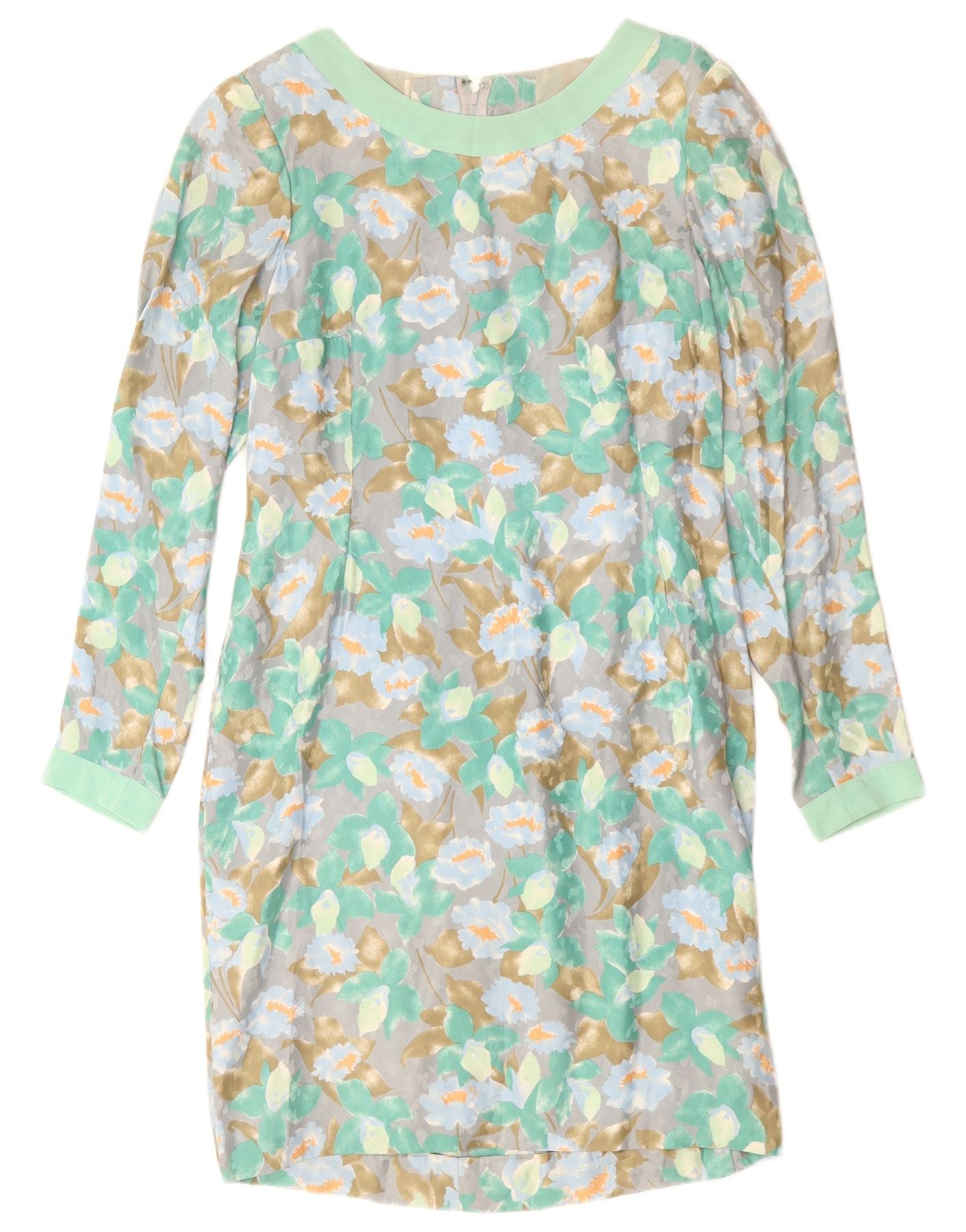 Vintage Damen Langarm-Etuikleid UK 12 Mittelgrün geblümt