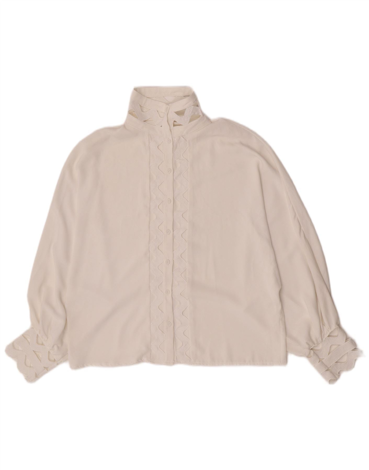 - KI-Beschreibung: Dieses Damenblusenoberteil von Vincenove ist aus glattem, cremefarbenem, gewebtem Polyester gefertigt. Es verfügt über einen hohen Kragen und ein markantes Kragendesign. Lange Ärmel mit eleganten Bündchendetails. Die vordere Knopfleiste und die Manschetten weisen ein zartes geometrisches Lochmuster auf. Ein Knopfverschluss sichert die Vorderseite. Die reguläre Passform bietet eine bequeme Silhouette.