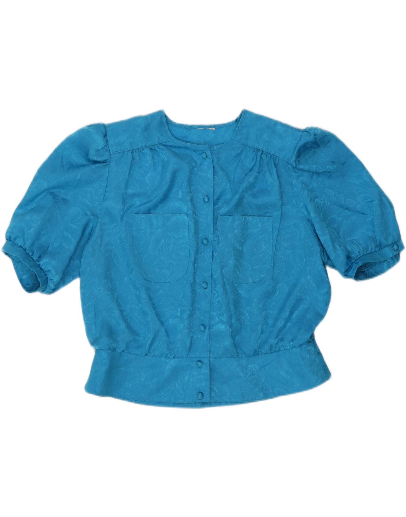 - AI Description: This Vintage womens blouse top is crafted from a lightweight blue woven fabric. It features a striking abstract pattern throughout. The classic round neckline and short sleeves offer a timeless silhouette. A full button-up front provides versatile styling options. The regular fit ensures comfortable wear. Subtle front pockets add practical detail, completing this distinctive 80s inspired piece.