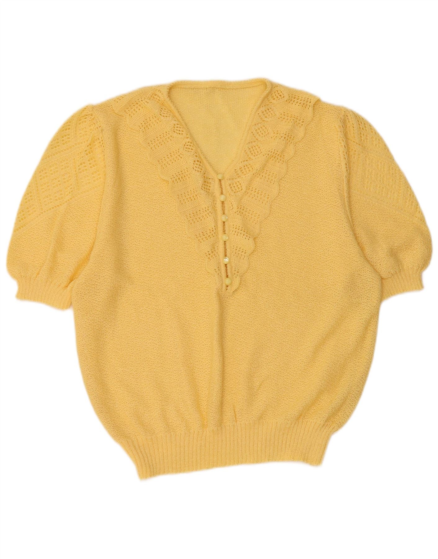 VINTAGE Damen Kurzarm-Pullover mit V-Ausschnitt, UK 16, Größe L, Gelb