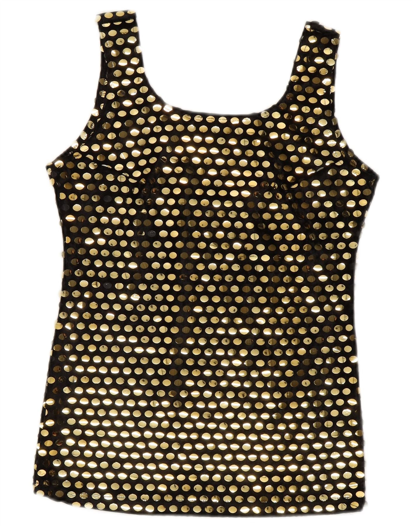- KI-Beschreibung: Dieses Vintage-Westenoberteil für Damen ist aus 100 % Polyester-Strickstoff gefertigt. Es verfügt über eine durchgehende goldene Paillettenverzierung auf schwarzem Grund, die einen auffälligen mehrfarbigen Effekt erzeugt. Das Oberteil hat einen klassischen Rundhalsausschnitt und ein ärmelloses Design. Es bietet eine normale Passform für angenehmen Tragekomfort. Dieser Pulloverstil eignet sich perfekt für Festivalkleidung und verleiht ihm einen Hauch von Glanz und Glamour.
