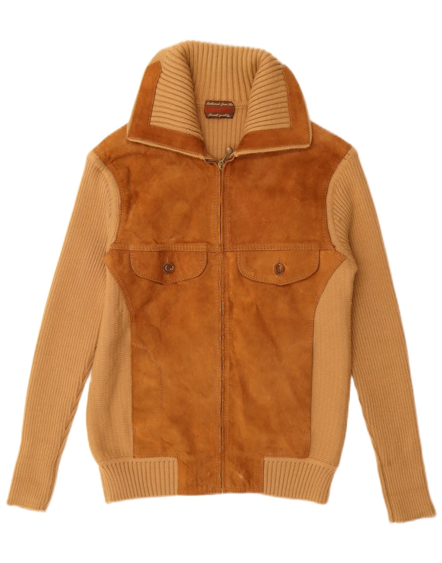 VINTAGE Damen-Strickjacke aus Wildleder, UK 12, Mittelbeige, Farbblock