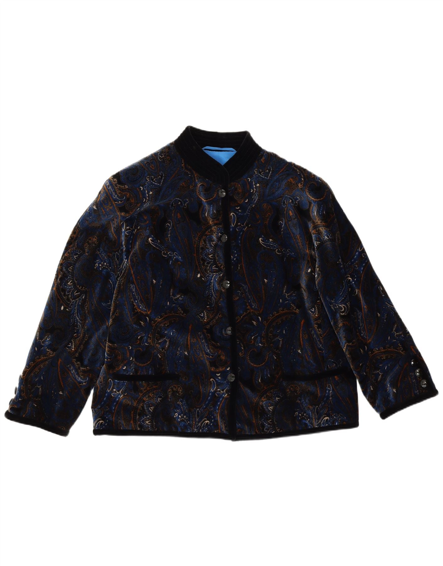 Home > Damen > Depop-Kleidung > VINTAGE Damen Samt 5-Knopf-Blazerjacke UK 14 Großes blaues Paisleymuster