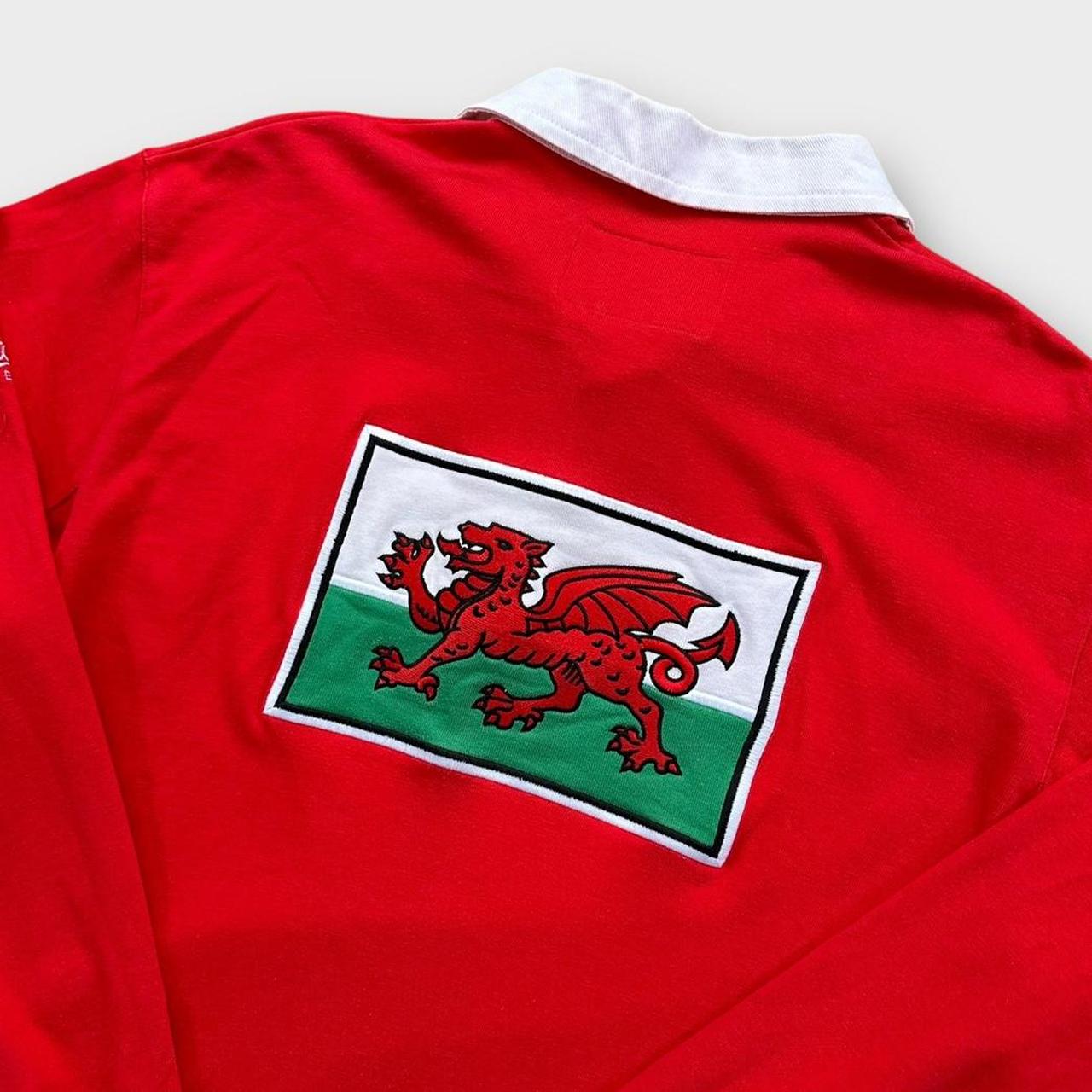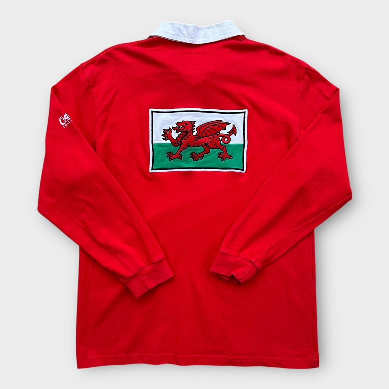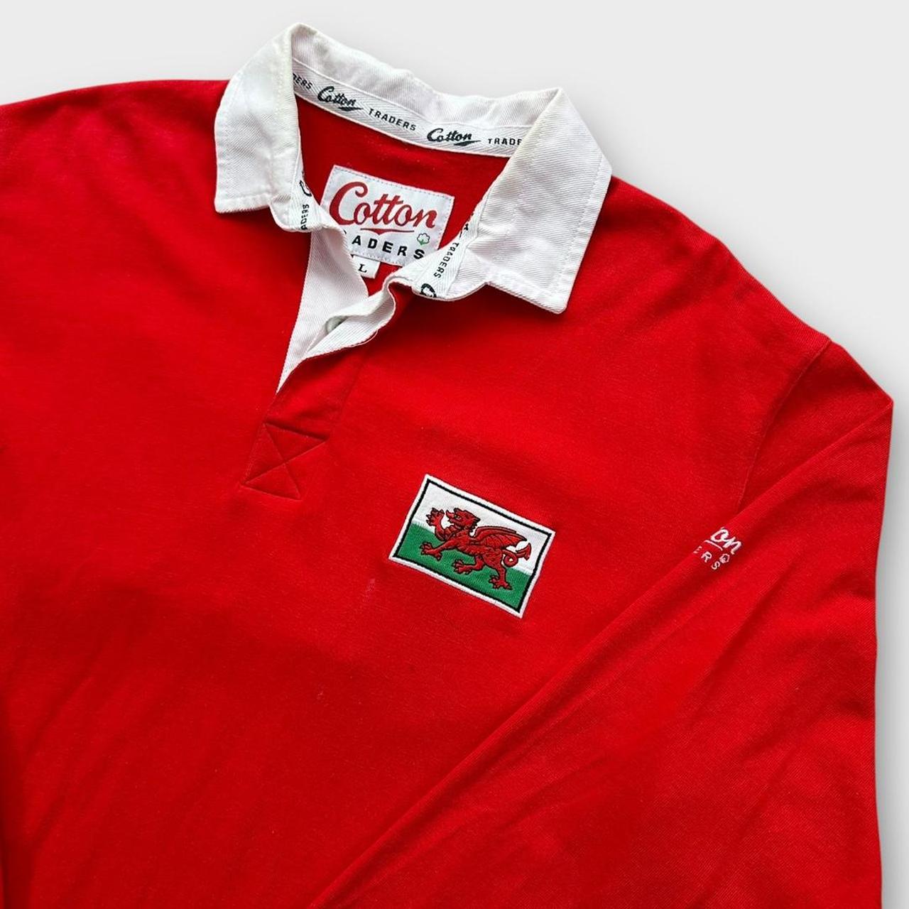 Vintage-90er-Rugbyoberteil aus Wales von Cotton Traders in Rot und Weiß mit gestickten Logos auf der Brust und dem Rücken
