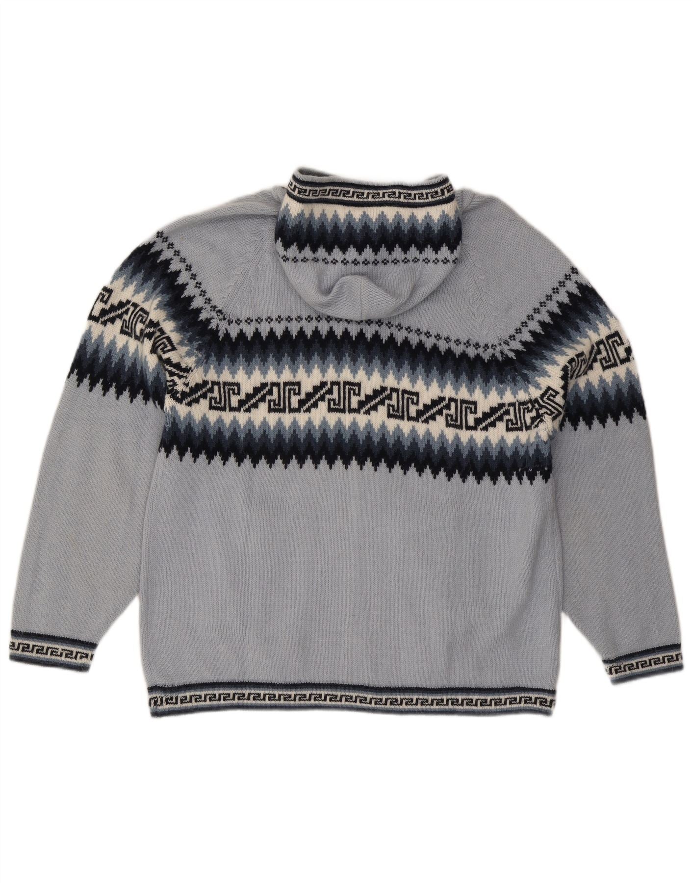 - KI-Beschreibung: Dieser Vintage-Cardigan für Damen ist aus Superfina-Alpakawolle gefertigt und bietet eine weiche, luxuriöse Strickstruktur. Es verfügt über eine auffällige blaue Basis mit einem geometrischen Aztekenmuster in kontrastierenden Farbtönen. Das Kapuzendesign und der hohe Kragen sorgen für Wärme. Vorne verläuft ein durchgehender Reißverschluss. Lange Ärmel und eine normale Passform sorgen für Komfort. Praktische Taschen sind in das Design integriert.