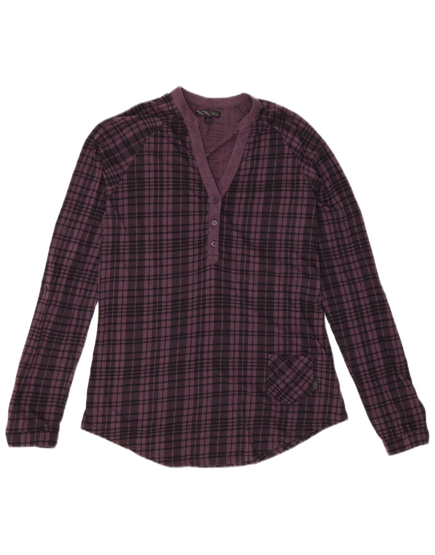 - AI Description: This Vans womens blouse top is crafted from soft 100 percent cotton woven fabric. It features a classic purple plaid pattern. The Henley neckline with button closure offers a casual yet refined look. Long sleeves provide comfortable coverage. A regular fit ensures ease of wear. A subtle chest pocket adds practical detail. This versatile top is perfect for everyday styling.
