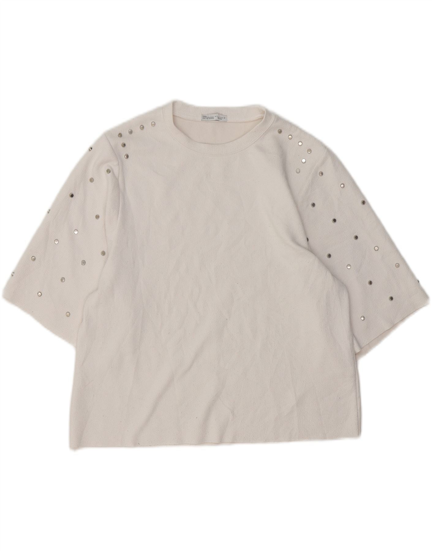 - KI-Beschreibung: Dieses T-Shirt-Oberteil für Damen von Zara ist aus einem cremefarbenen, strukturierten Jerseystoff gefertigt. Es verfügt über einen klassischen Rundhalsausschnitt und kurze Ärmel. Silberfarbene Nieten zieren die Ärmel und setzen einen modernen Akzent. Die verkürzte Länge bietet eine moderne Silhouette. Seine reguläre Passform sorgt für angenehmen Tragekomfort.