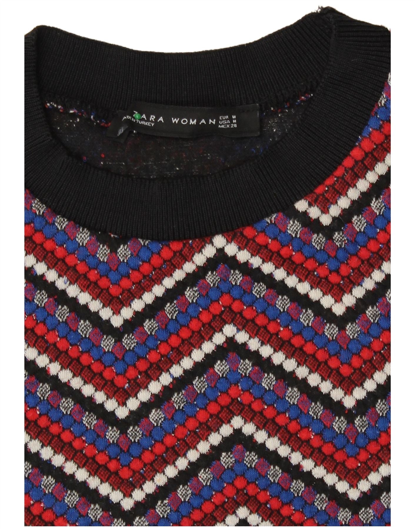 - KI-Beschreibung: Dieser Damen-Pullover mit Rundhalsausschnitt von Zara verfügt über ein lebendiges, mehrfarbiges Chevron-Muster. Es besteht aus einem bequemen Strickstoff und bietet eine weiche Textur. Der Rundhalsausschnitt und die langen Ärmel sorgen für eine klassische Silhouette. Die reguläre Passform sorgt für ein angenehmes Tragegefühl. Das geometrische Design in Rot, Blau und Weiß sorgt für eine auffällige Retro-Ästhetik. Dieser Pulloverstil bietet sowohl Komfort als auch eine unverwechselbare Optik.