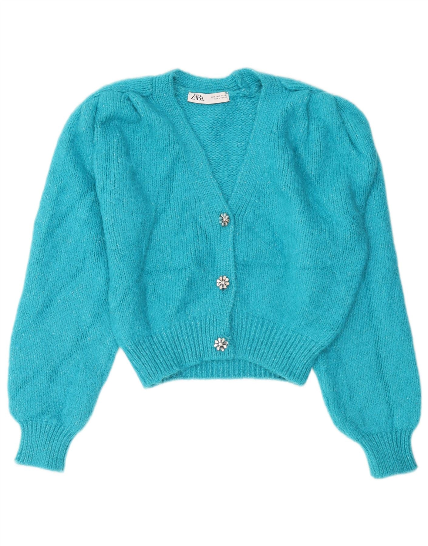 ZARA Damen Crop Cardigan Pullover UK 10 Small Blau Acryl