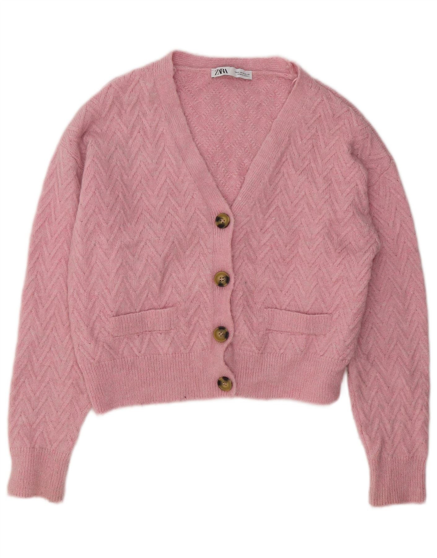 ZARA Damen Crop Cardigan Pullover UK 14 Mittelrosa Chevron Acryl