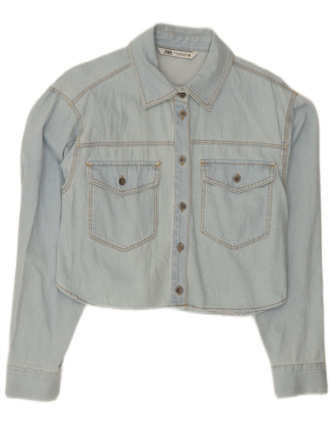 - KI-Beschreibung: Diese Damen-Hemdbluse von Zara ist aus hellblauem Baumwolldenim gefertigt. Es verfügt über einen Kragenausschnitt und eine durchgehende Knopfleiste vorne. Die langen Ärmel enden in geknöpften Manschetten. Seine verkürzte Länge bietet eine moderne Silhouette. Zwei Brusttaschen mit Knopfklappen sorgen für funktionelle Details. Die reguläre Passform sorgt für angenehmen Tragekomfort.