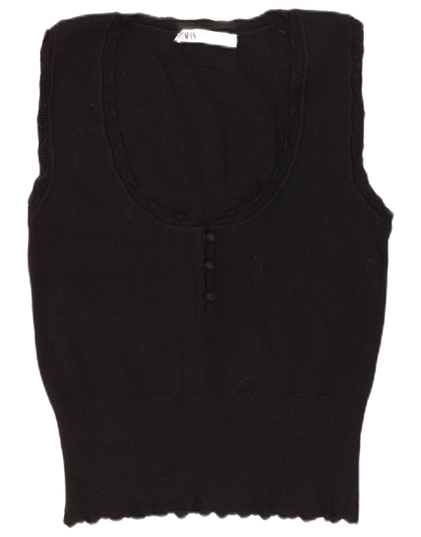 - KI-Beschreibung: Dieses Damen-Trägershirt von Zara ist aus einer bequemen schwarzen Viskose-Strickmischung gefertigt. Es bietet eine weiche, dehnbare Textur. Die schmale Passform und das ärmellose Design sorgen für eine schlanke Silhouette. Es verfügt über einen klassischen Rundhalsausschnitt. Ein zartes Rüschendetail ziert den vorderen Ausschnitt. Ton-in-Ton-Knöpfe verlaufen vorne entlang und setzen dezente Akzente. Der Saum ist außerdem mit einer Wellenkante versehen.