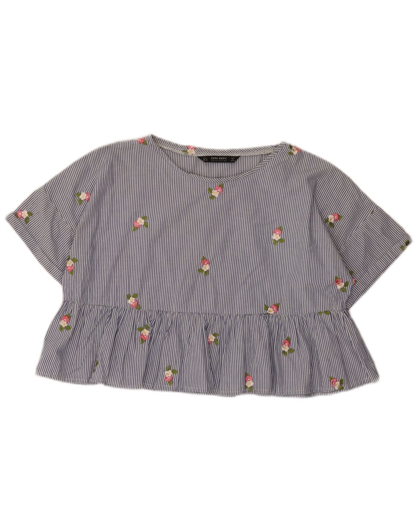 - KI-Beschreibung: Dieses Damen-Blusenoberteil von Zara ist aus 100 % gewebtem Baumwollstoff gefertigt. Es verfügt über ein klares blaues Streifenmuster, das mit zarten gestickten Blumen verziert ist. Der Rundhalsausschnitt und die kurzen Ärmel sorgen für eine klassische Silhouette. Ein stylischer Schößchensaum verleiht diesem Regular-Fit-Crop-Top eine feminine Note. Es ist ein Pullover-Stil, perfekt für einen lässigen und dennoch schicken Look.